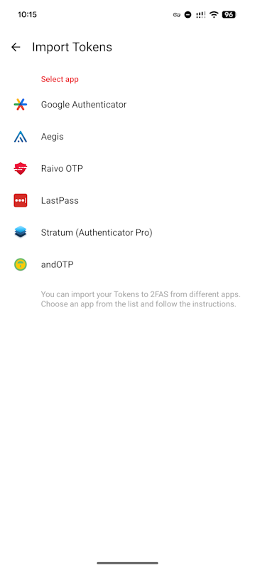 You can import existing tokens from Google Authenticator, Aegis, Raivo OTP, LastPass, Stratum, and andOTP. Importing will take some time, as you still need to add the codes one by one.