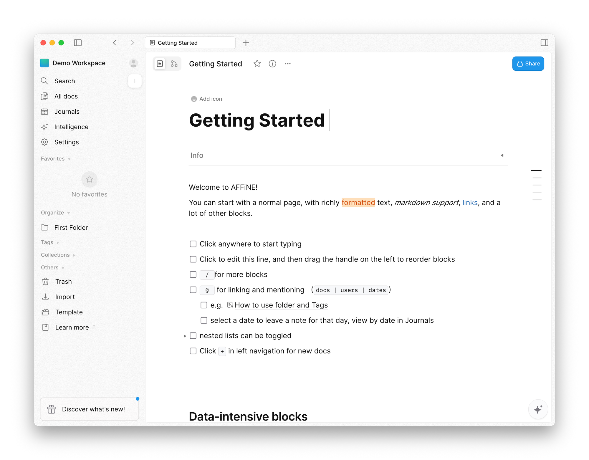 AFFiNE supports journals and reminders for notes. Workspaces can also be shared, allowing collaboration with colleagues or friends.