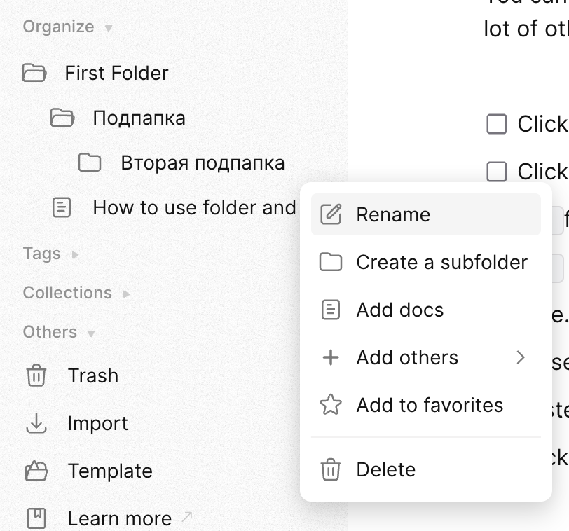 Notes can be organized into folders with unlimited nesting. Tags and collections are also supported.