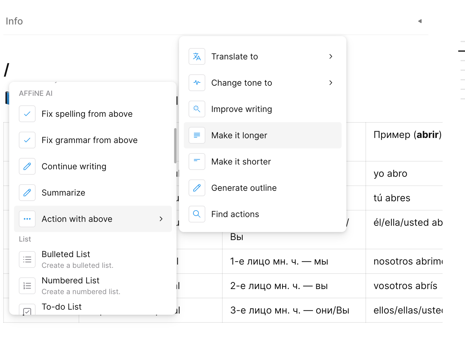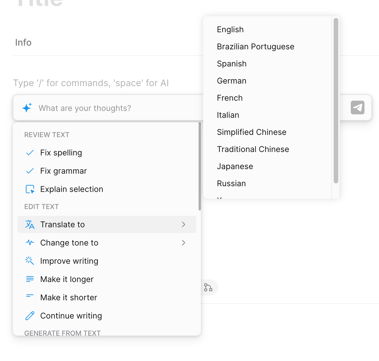 First option: open the command menu inside a note and choose an AI action — for example, start a conversation or summarize the text.