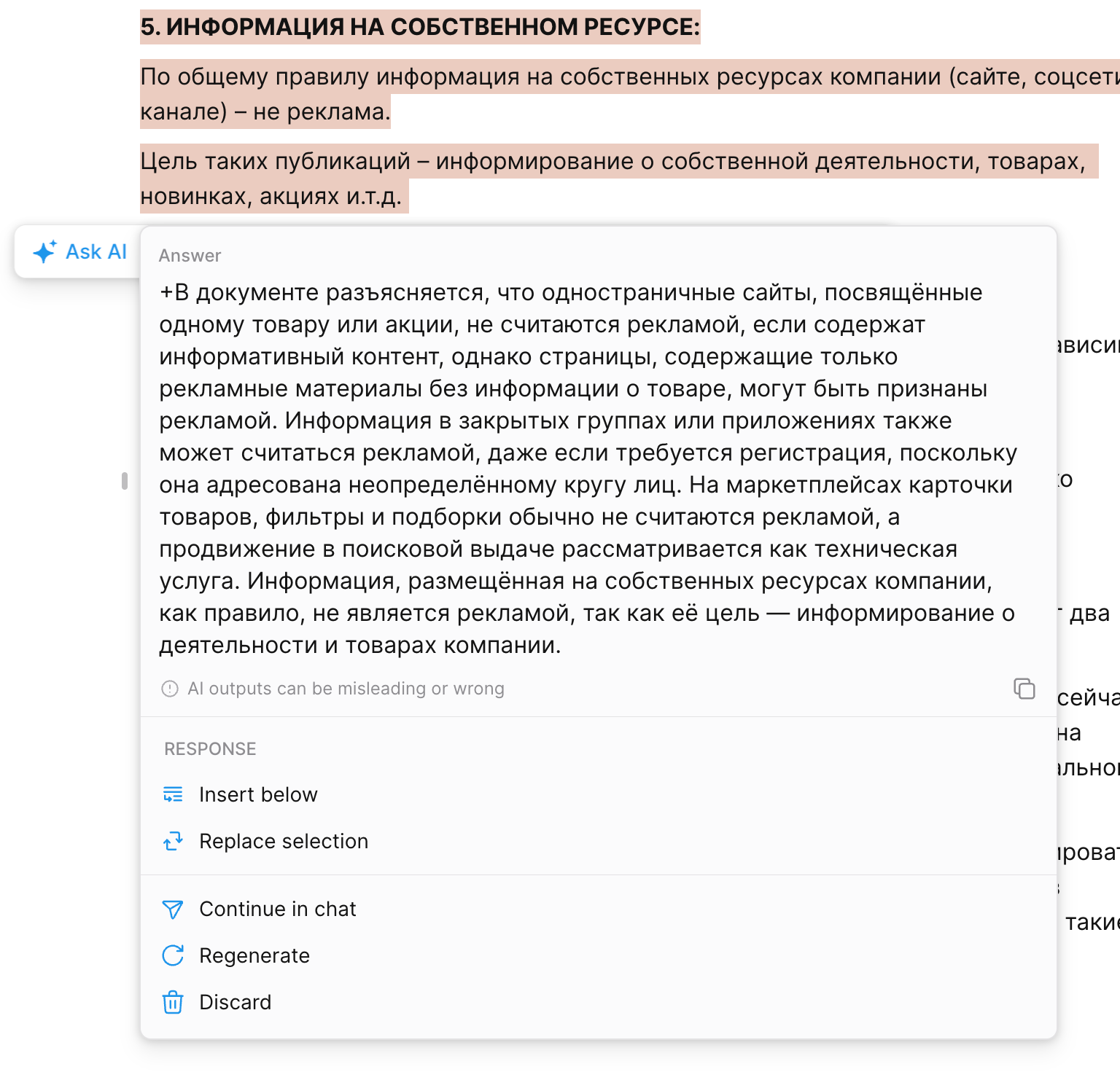 The AI response can be inserted below the text, replace the original content, or be continued in a full chat interface.