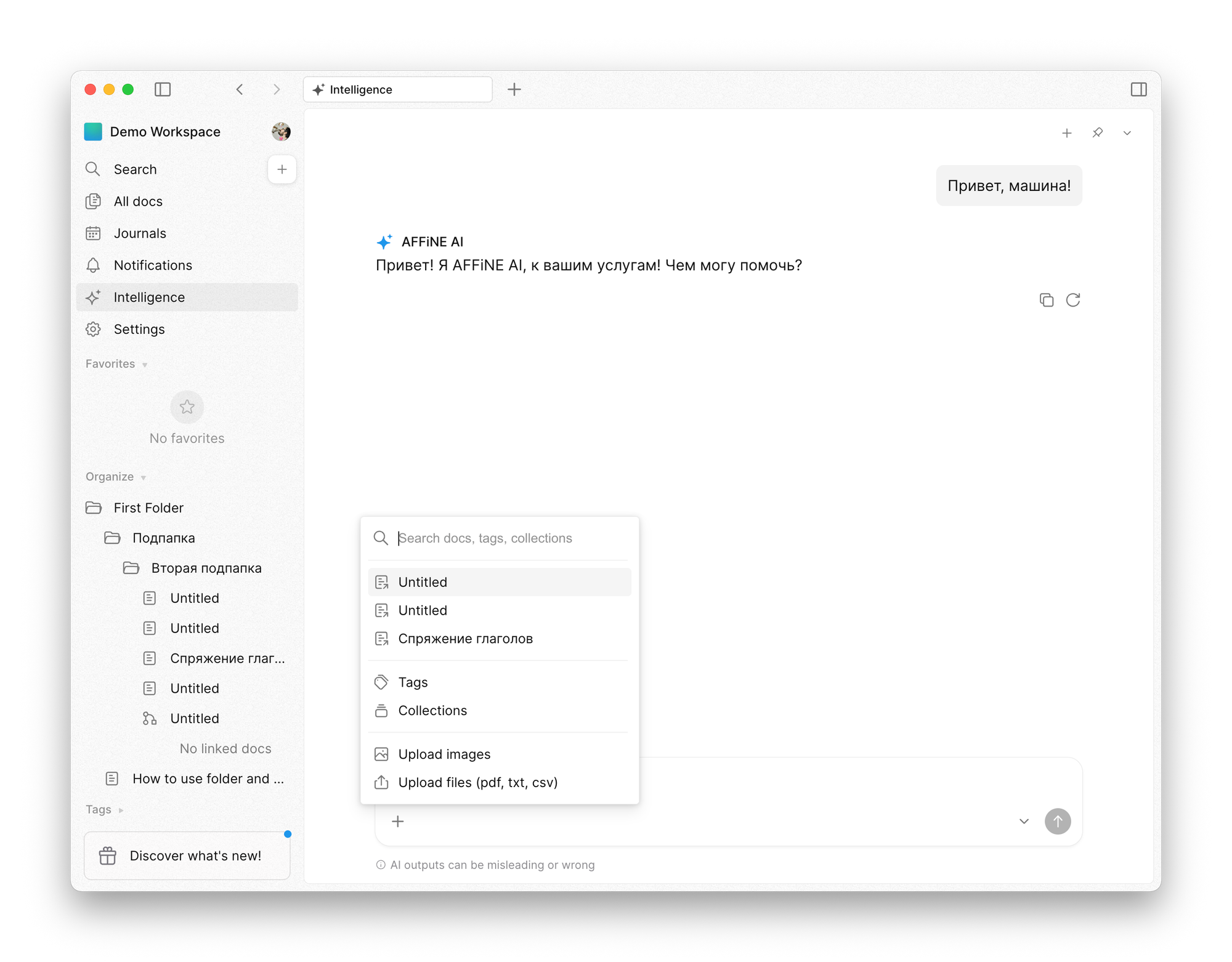 Third option: a full-featured AI chat. If you’ve used ChatGPT before, this will feel very familiar. One standout feature is the ability to add data from your knowledge base to the conversation — including tags and entire collections.