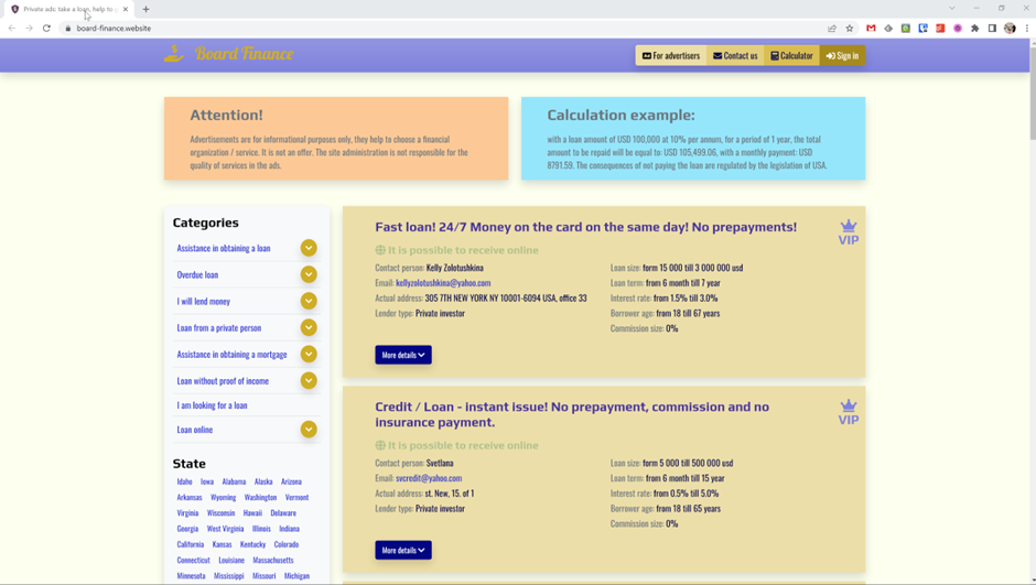 Board Finance helps you find a loan under almost any conditions and to suit your every preference. Just see for yourself by checking out the ads posted by people on Board Finance, offering help with loans and mortgages with no advance payment, and brokerage services no matter whether you have a bad credit history; bank advertisements are also available on our platform.