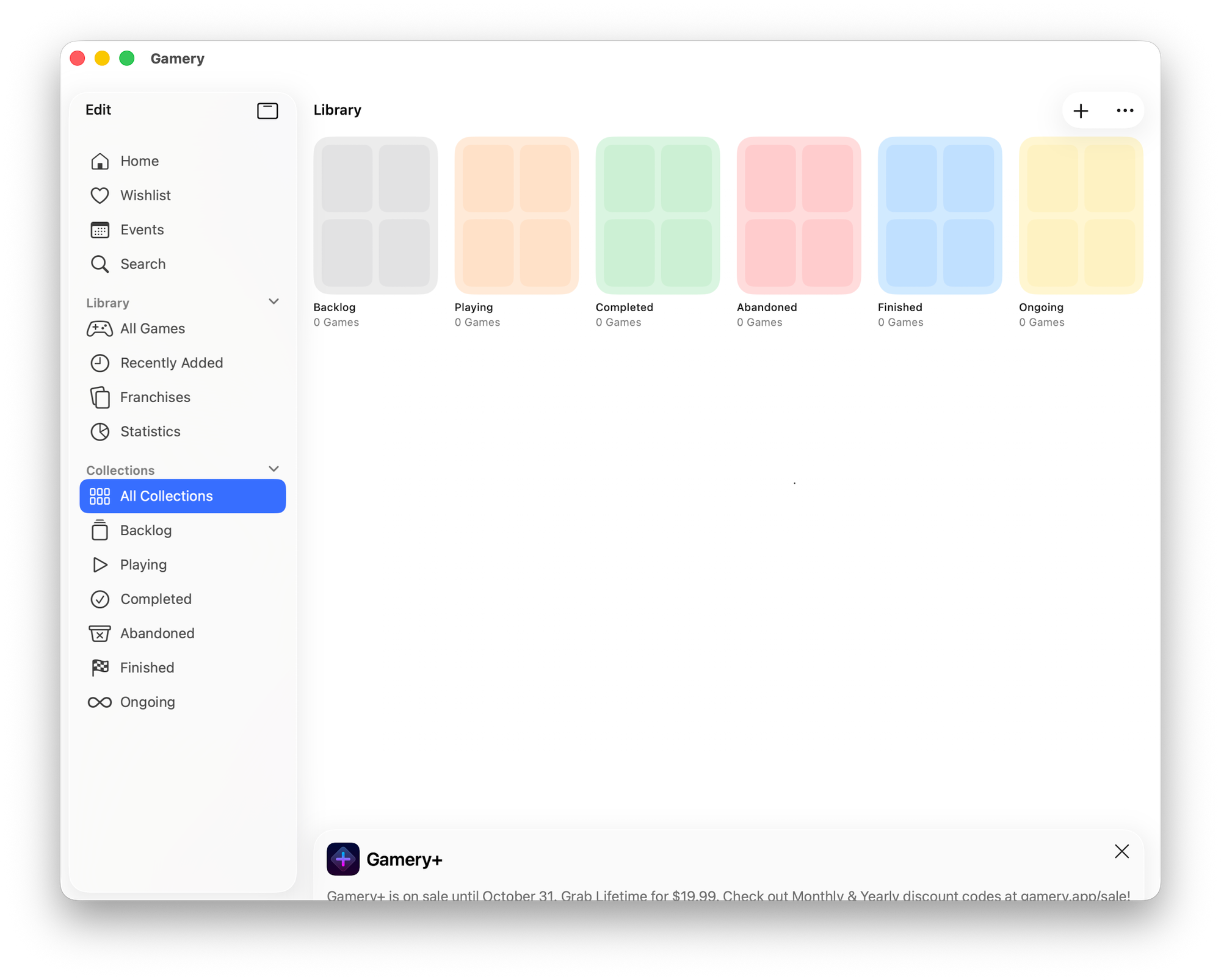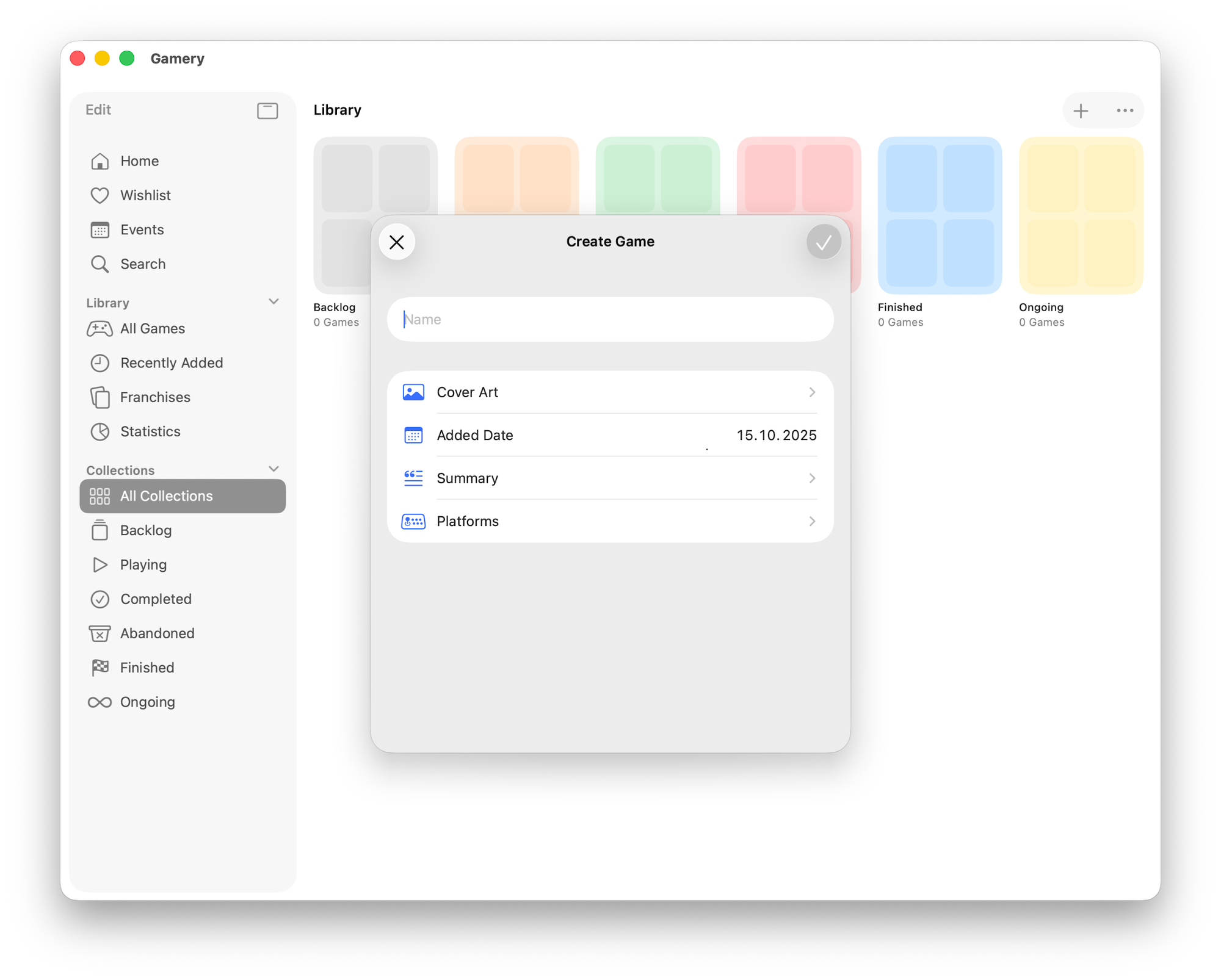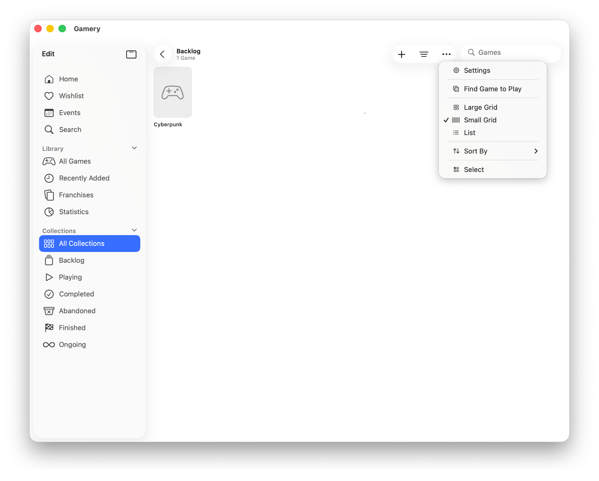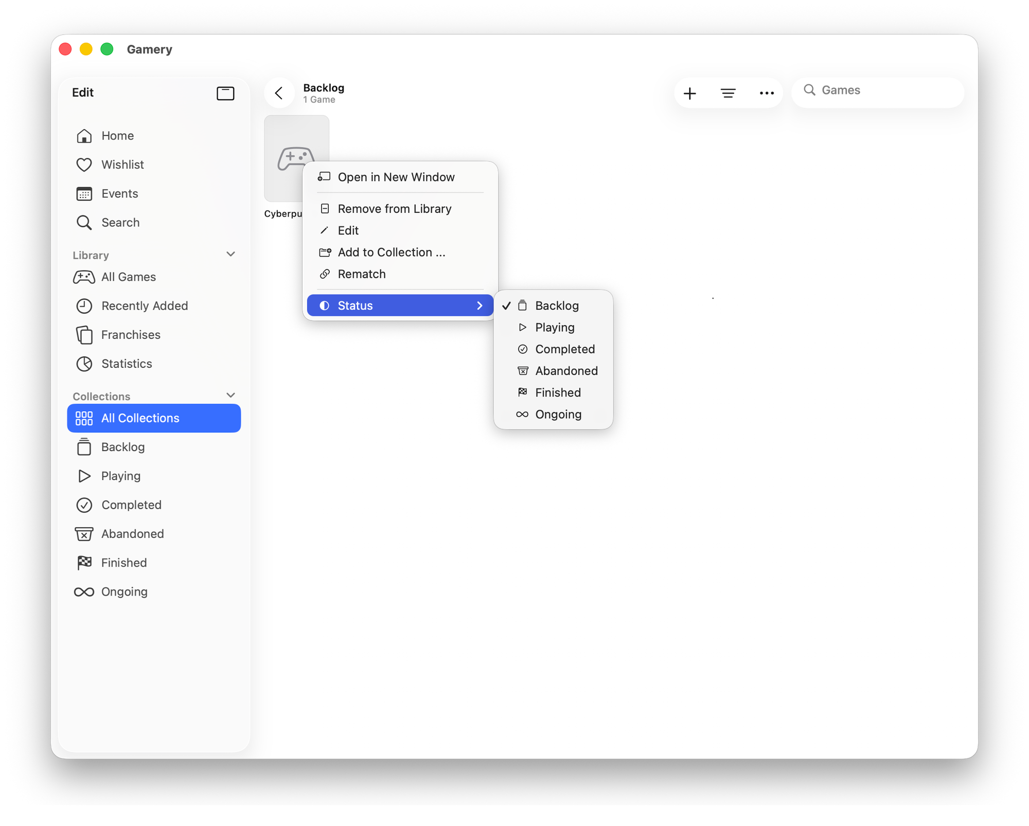 The core of Gamery is built around collections. By default, there are five collections that show the current status of a game: backlog, playing, dropped, etc.