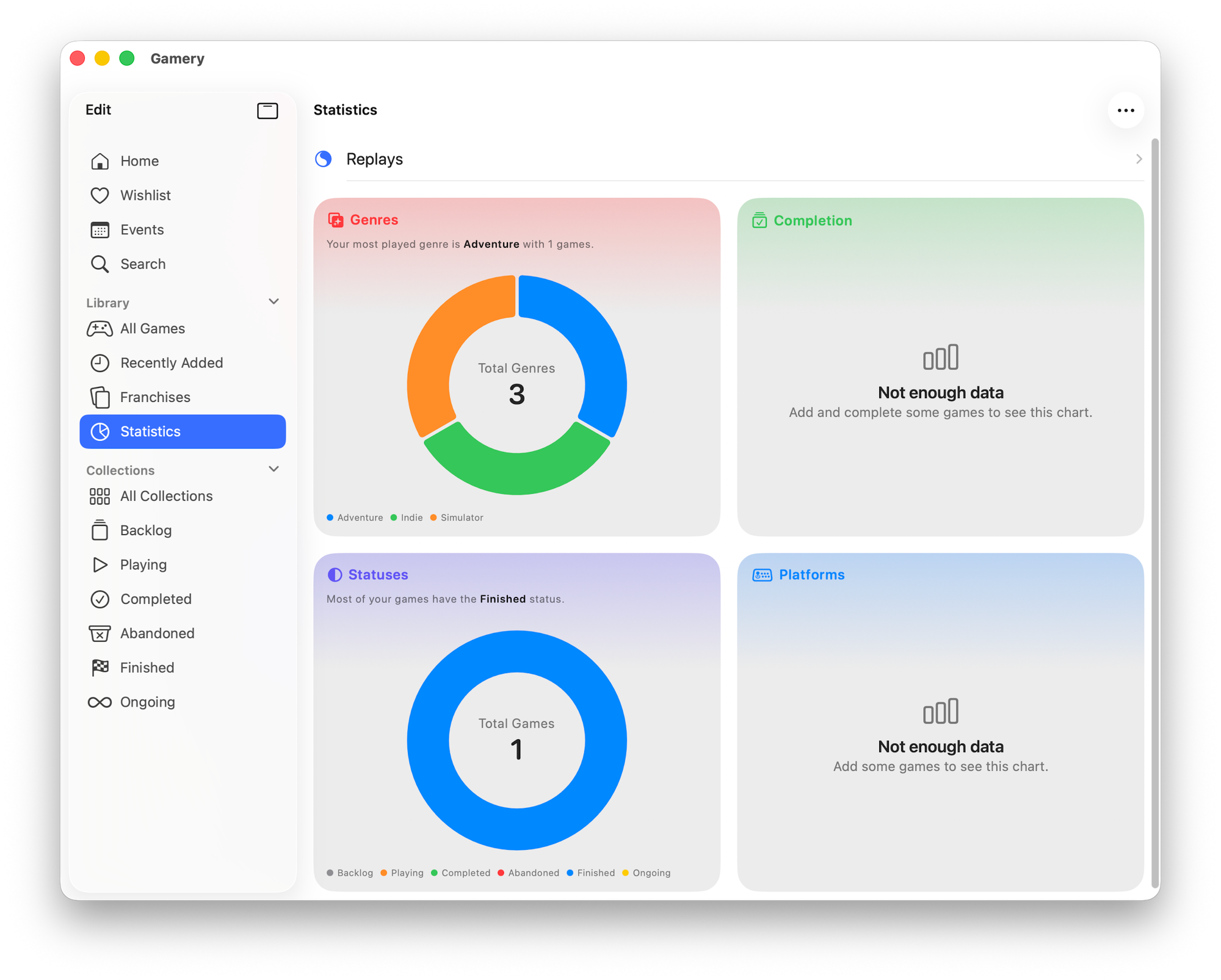 Gamery is an iOS app that lets you build your own game collections, manage a backlog, and get various analytics on your playthroughs.