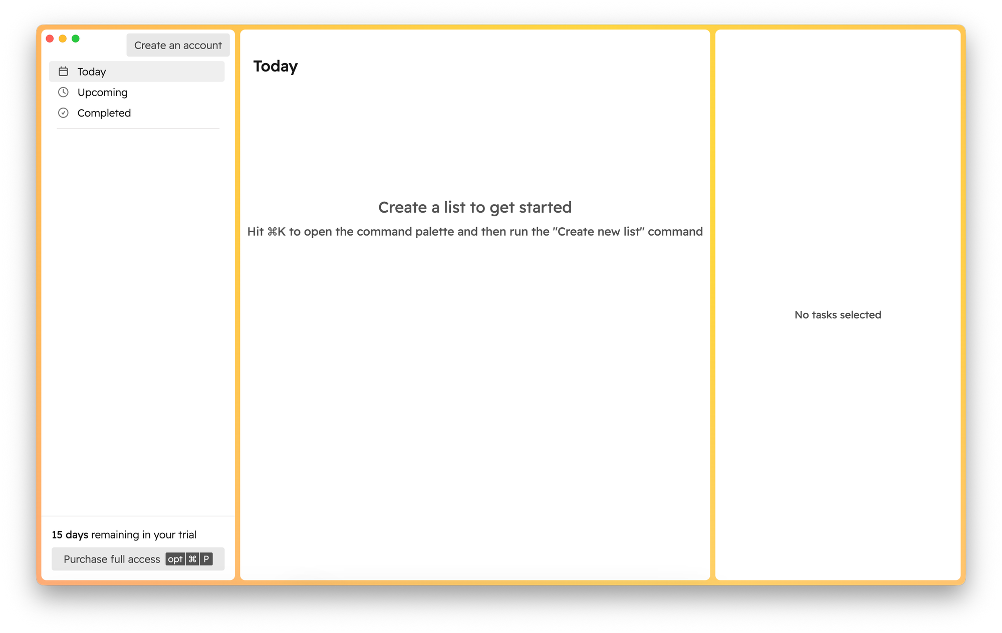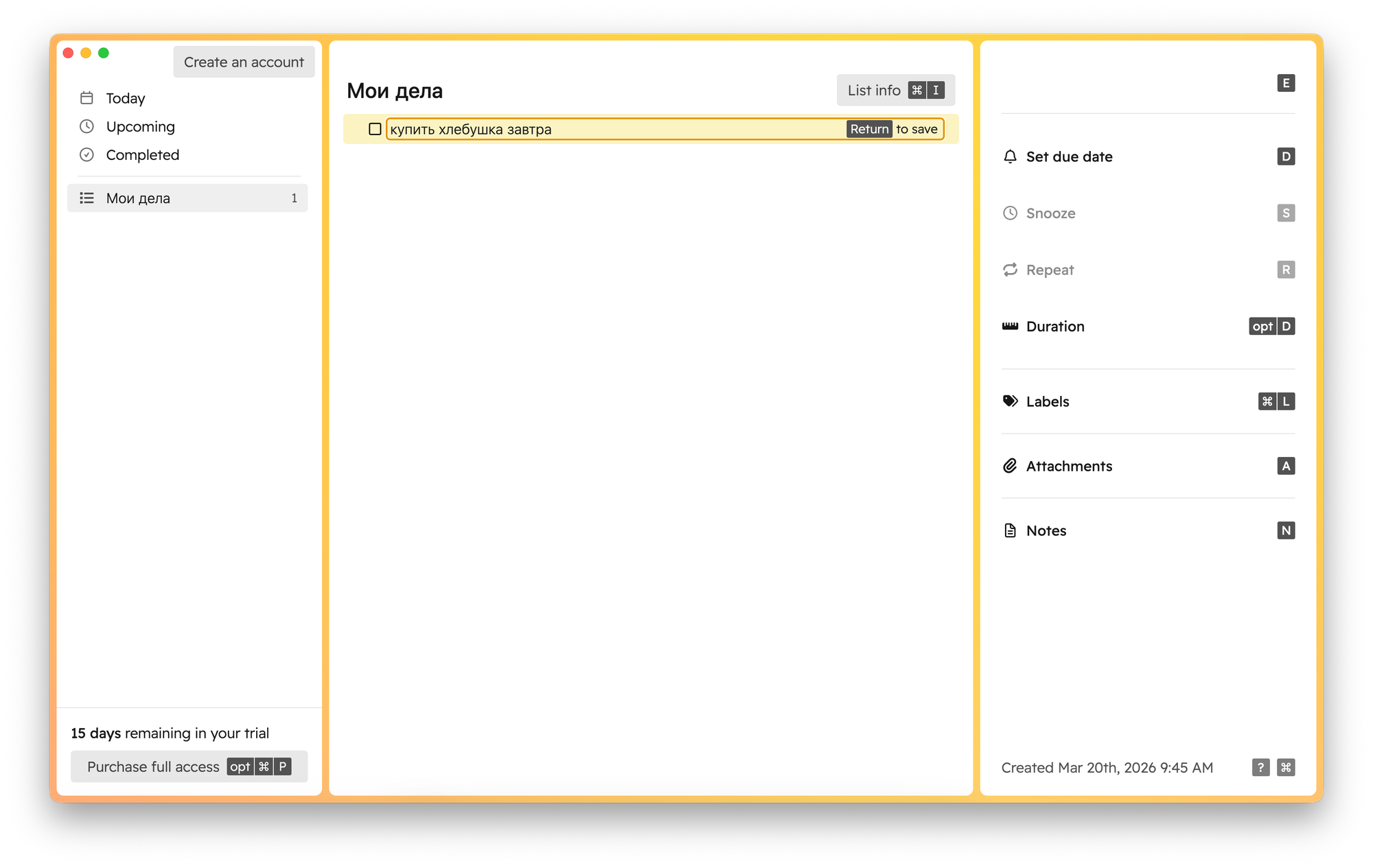 If you’re using Godspeed for the first time, you’ll need to create your first list. To do this, press the соответствующую shortcut and choose Create new list.
