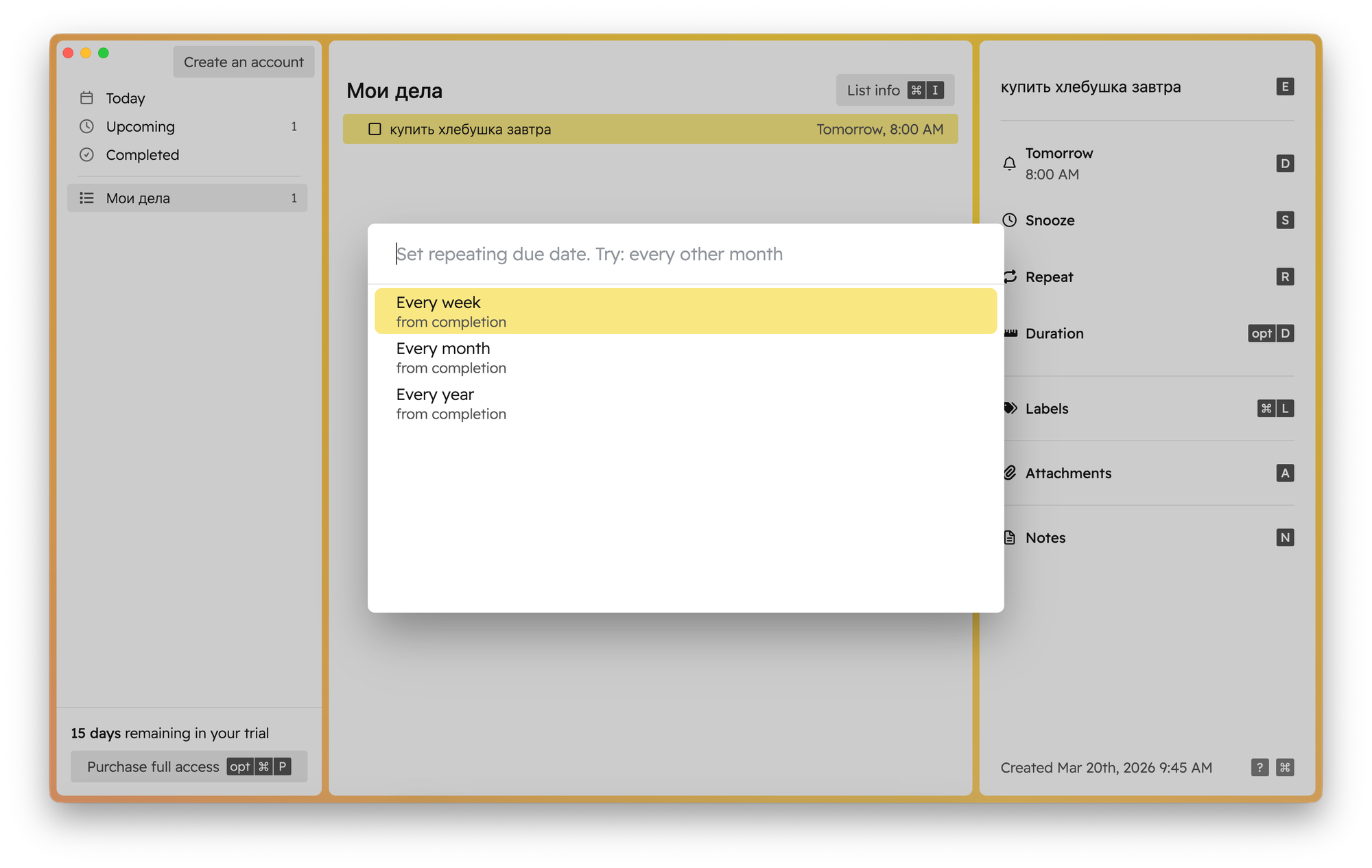 From my perspective, a few things stand out. Recurrence options are quite flexible, but there are some limitations. For example, you can’t set a task to repeat only on weekdays. Still, overall functionality is pretty flexible.