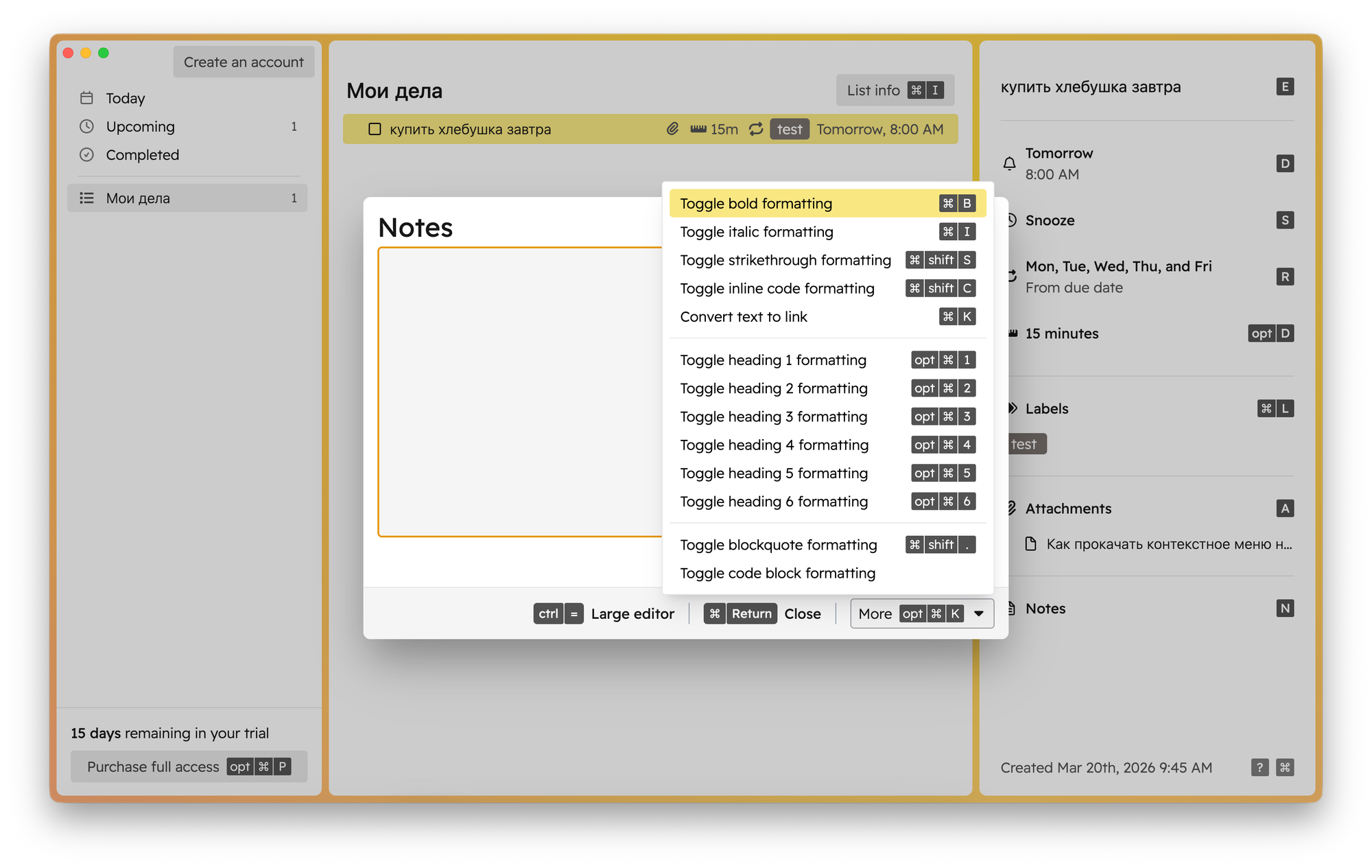 The app supports natural language input for setting deadlines and more—but only in English. You can add various types of additional content to a task:
