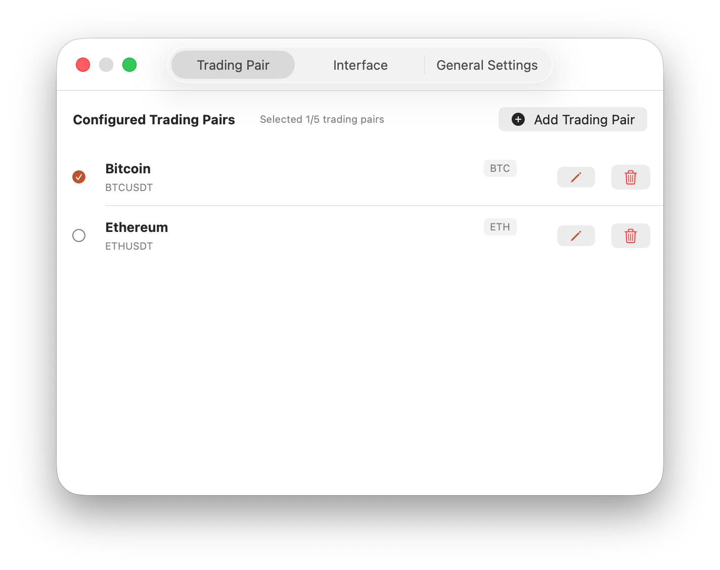 By default, the BTC price is shown, but you can add any other required trading pair in the settings.
