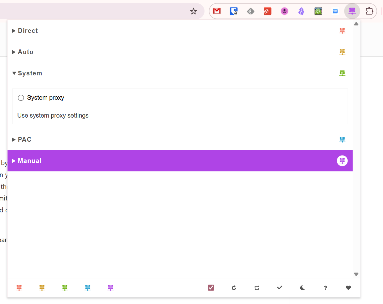 As a result, I installed the Proxy Switcher browser extension, which is available for Chrome and Firefox. With it, I can quickly separate the traffic I need and not worry about which connection is currently active.