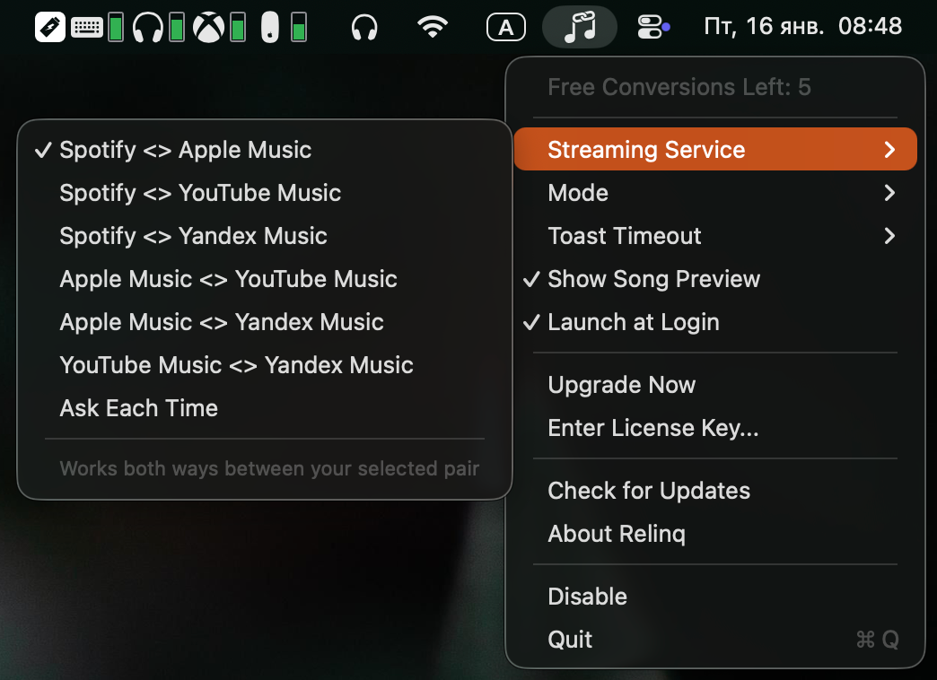 Relinq for macOS automatically converts track links between Spotify, Apple Music, and other services using a hotkey.
