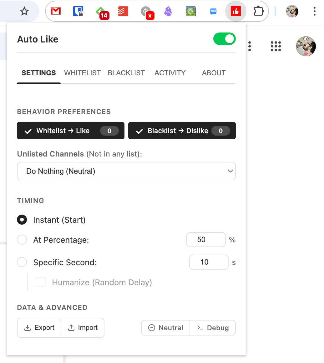 After installing it, you can configure automatic likes or dislikes for channels added to whitelist and blacklist categories. You can also define when exactly the action should happen: immediately, after a certain percentage of the video has been watched, or after a specific amount of time.