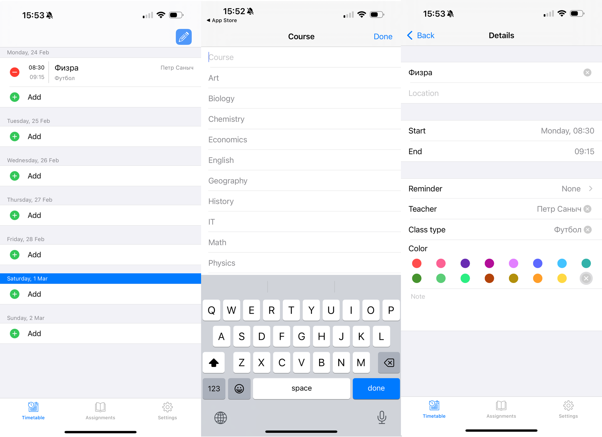 When adding a class, you can either choose a subject from the preset list or enter it manually. You can also specify the location, start and end times, reminders, teacher’s name, class type, color coding, and additional notes.