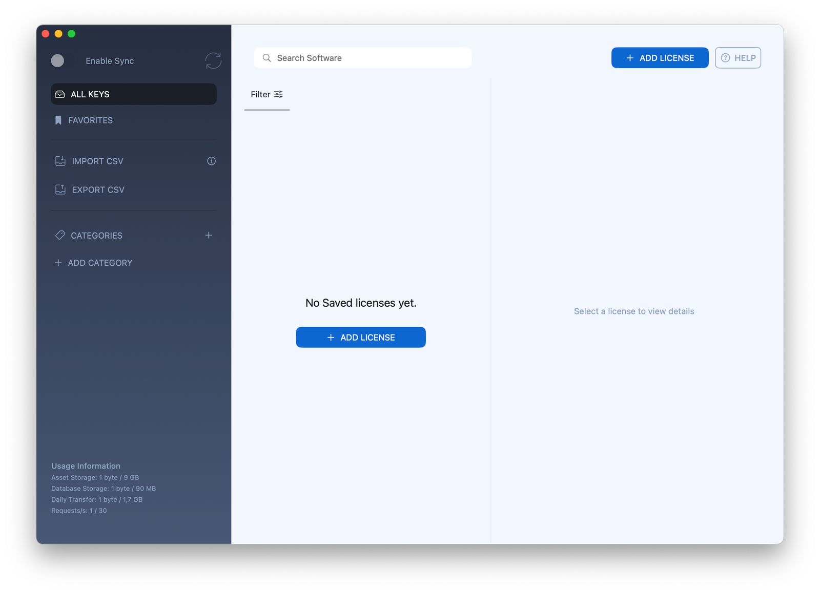 You can then start adding license data manually or import a pre-made list in .csv format.