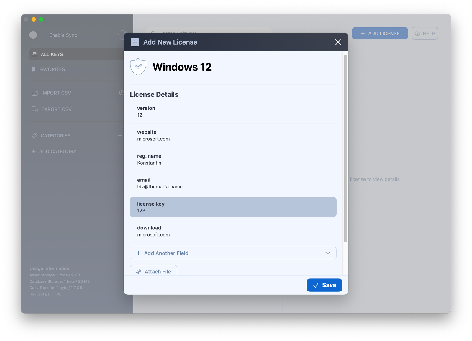 Each license entry can include all the necessary details: software name, publisher’s website, registered name and email, license key, and download link.