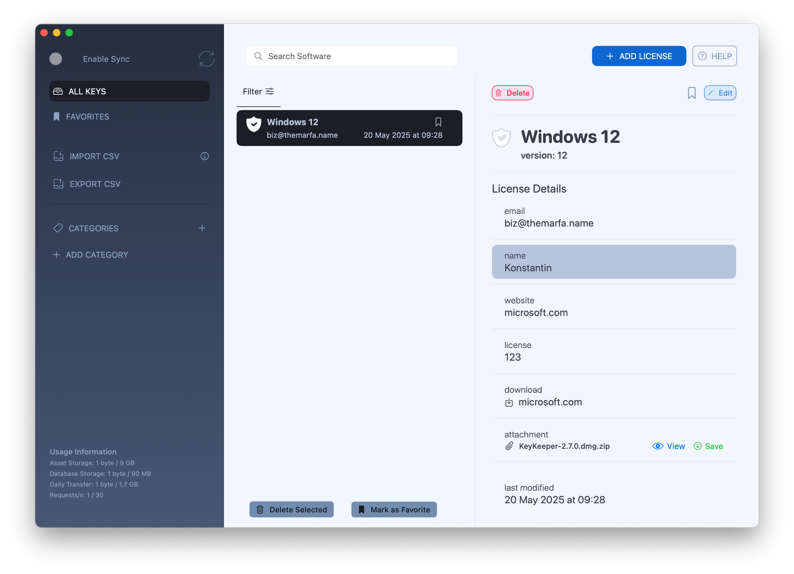 KeyKeeper is a license manager with password protection, key storage, and iCloud synchronization. The full version costs $11.99.