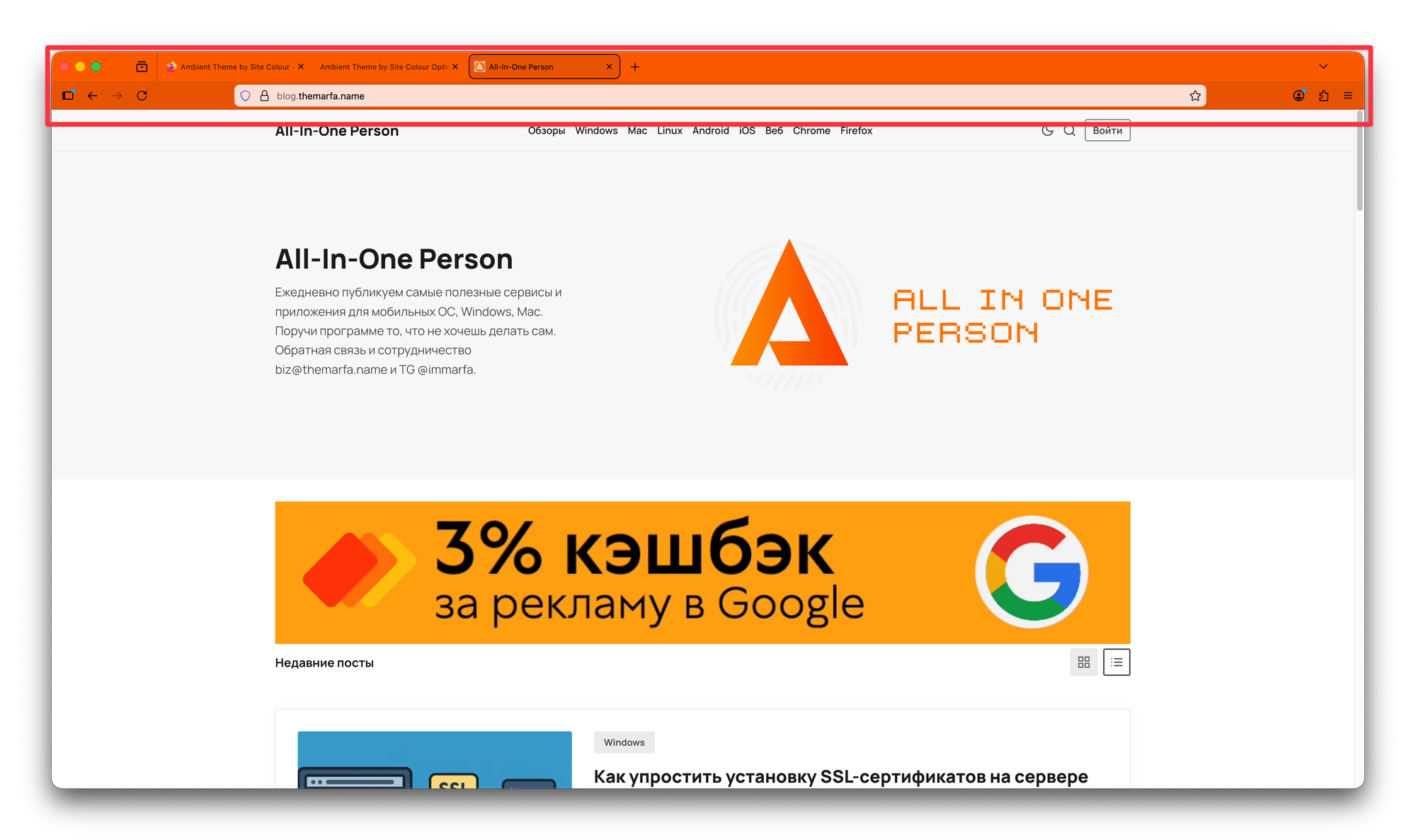 I like it when the color of the current window matches the rest of the environment. Usually, system colors depend on the desktop wallpaper — but the browser’s color can also be adapted to the website itself.