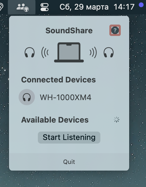 Once launched, the menu bar will display a list of currently connected devices, as well as those available for connection. To share the audio, you just need to select the devices for broadcasting and press the “Start Listening” button. The sound will immediately play on all selected headphones.
