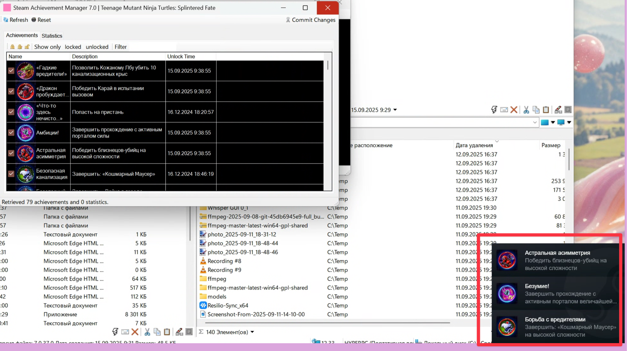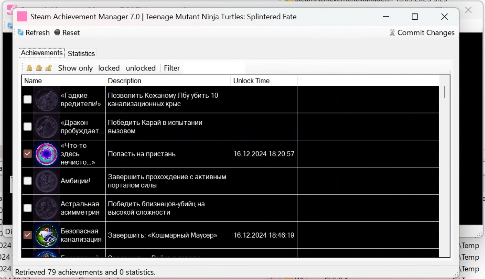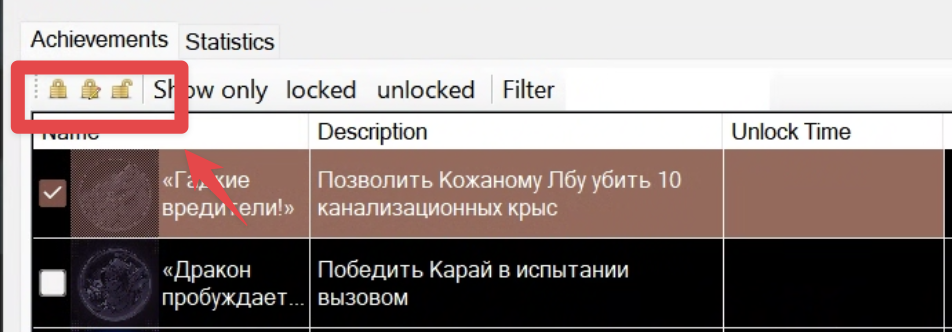 - The second toggles the status of achievements (unlocked become locked and vice versa).