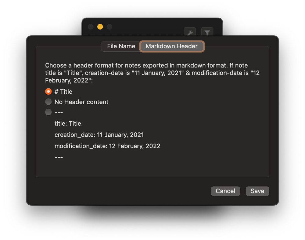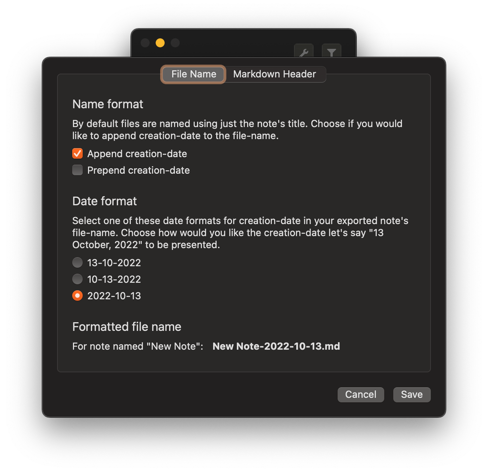 Before exporting, in the app settings, you can add the date at the beginning or end of the note name in the desired format. You can also choose formatting for the header.