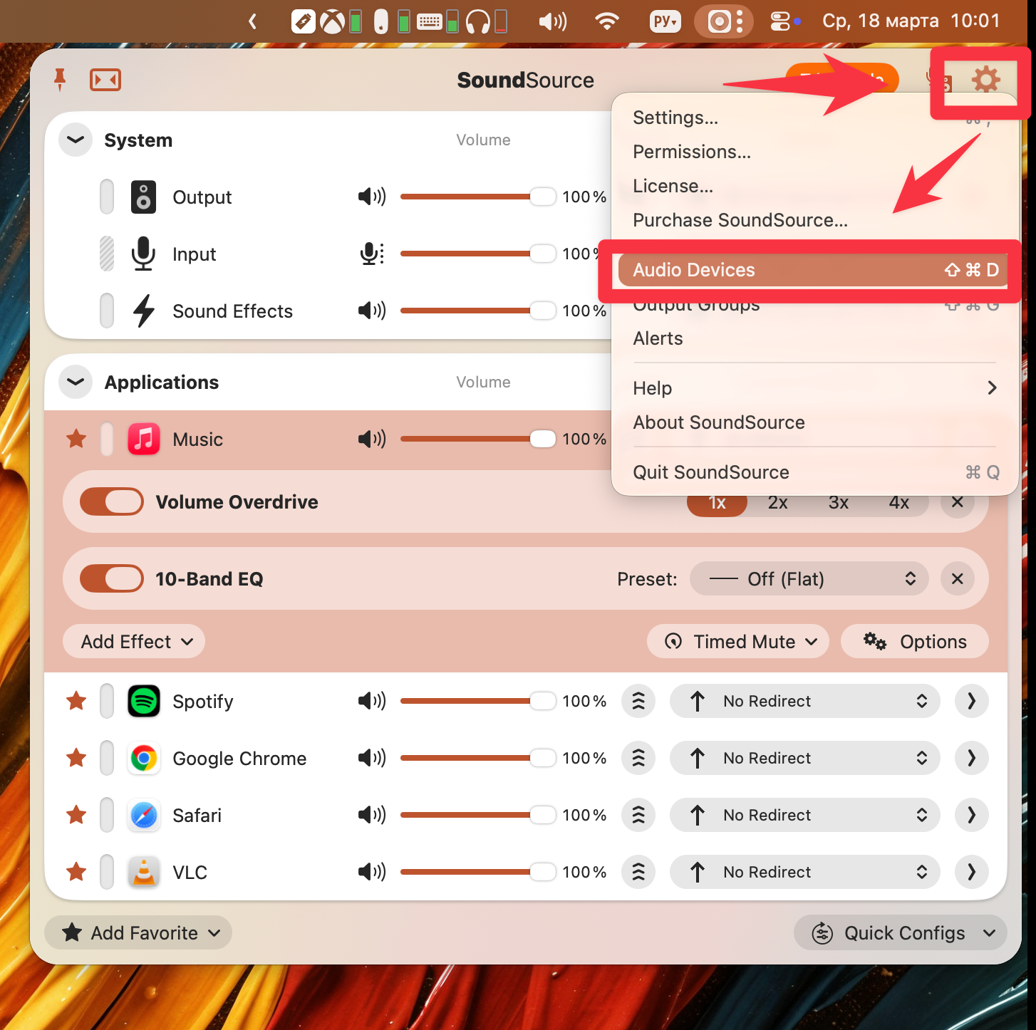 To limit the volume of a device, open the settings menu and select Audio Devices.