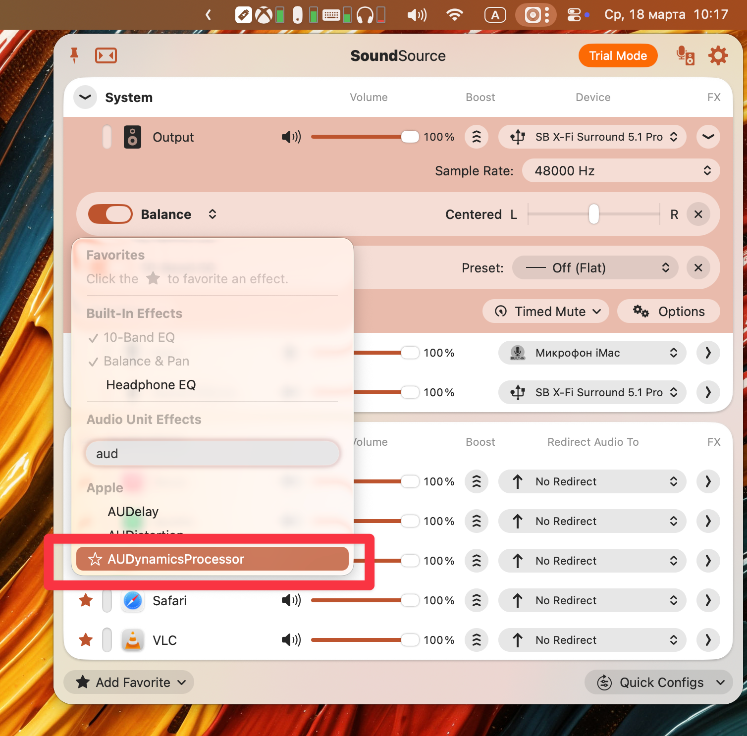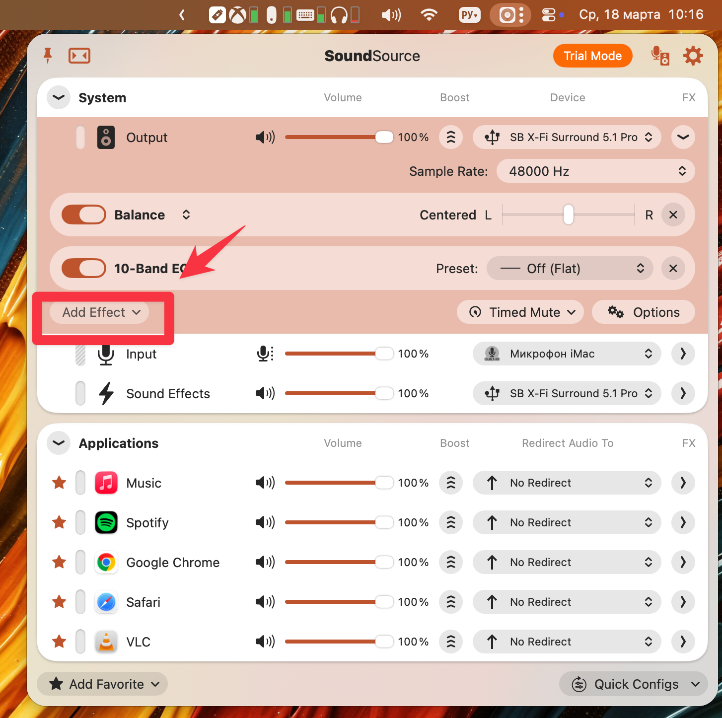 To do this, open the main SoundSource window and, in the System section for the output device, click Add Effect.