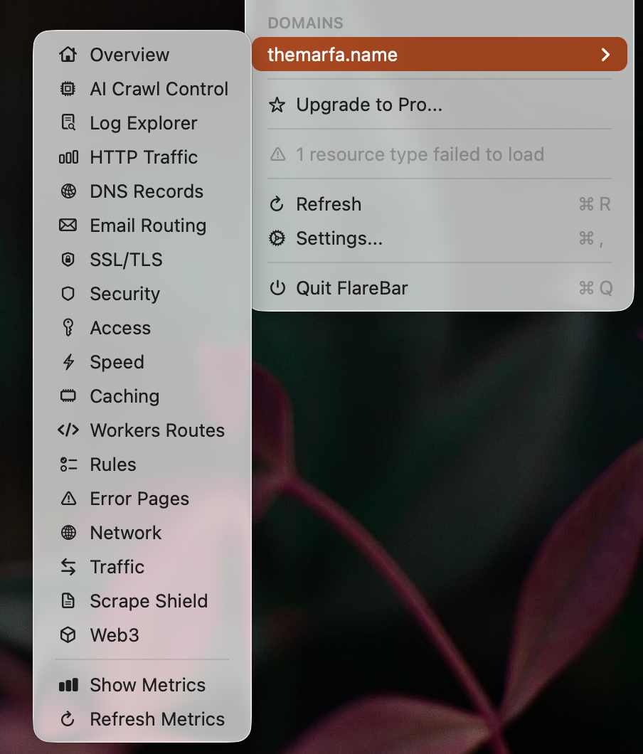 FlareBar is an app for quick Cloudflare management right from the menu bar: workers, domains, metrics. It offers both free and paid versions.