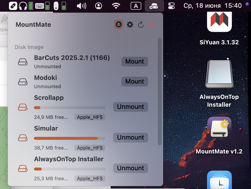 MountMate is a utility for managing virtual volumes directly from the menu bar: mount, unmount, view disk info, and configure auto-mount settings.