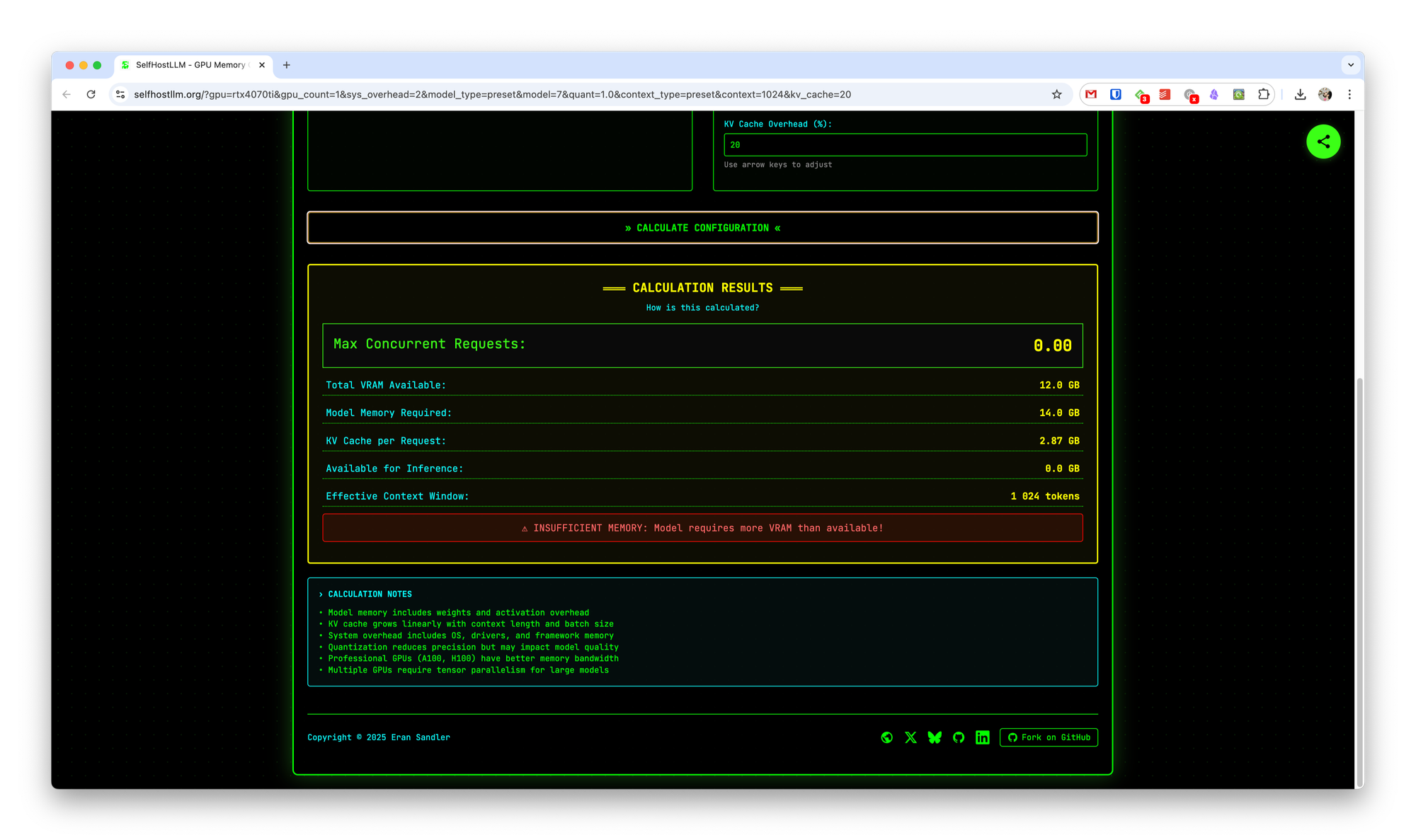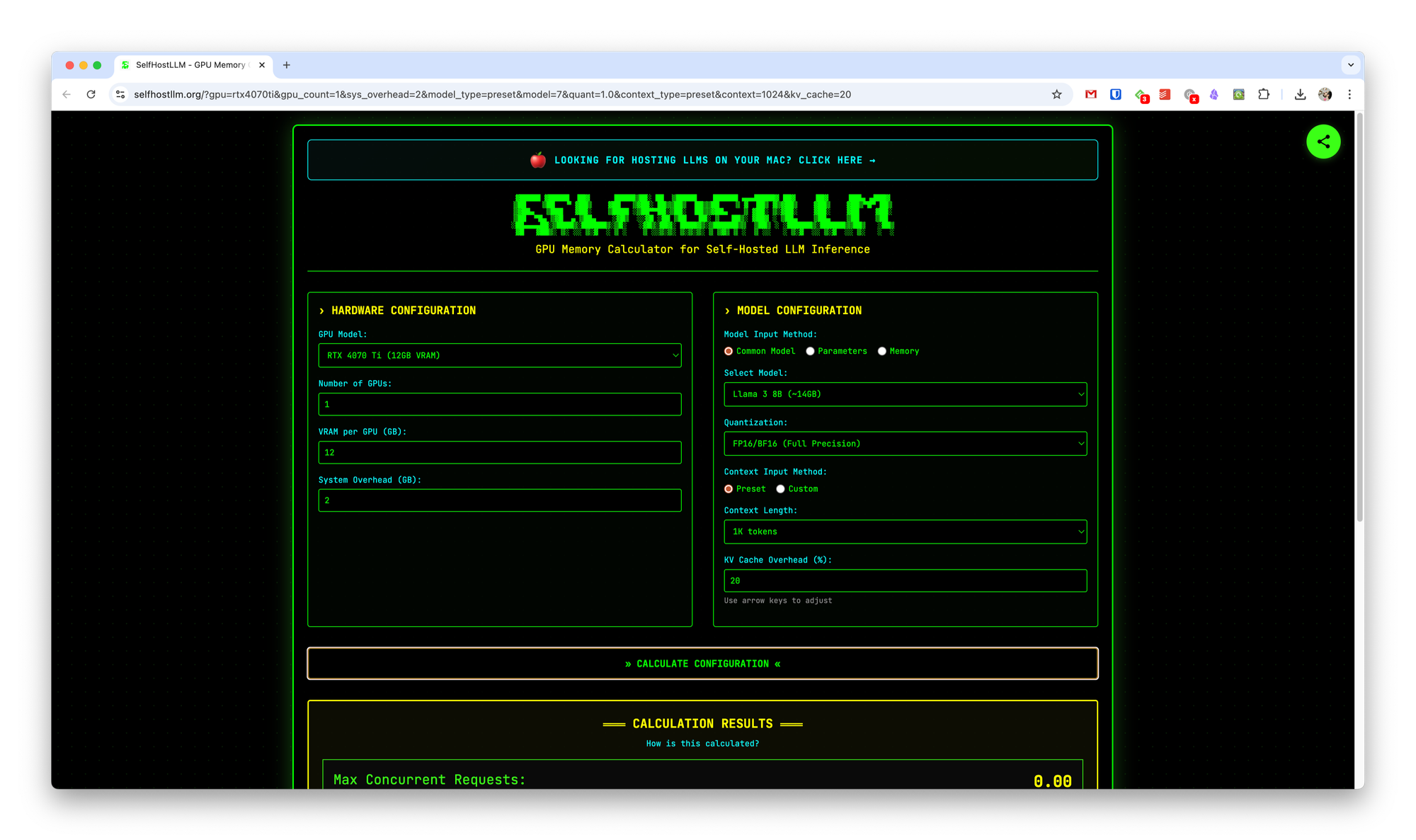 SelfHostLLM lets you check whether your GPU has enough power to run an LLM such as Llama or Mistral, and it calculates the optimal configuration for the model you choose.