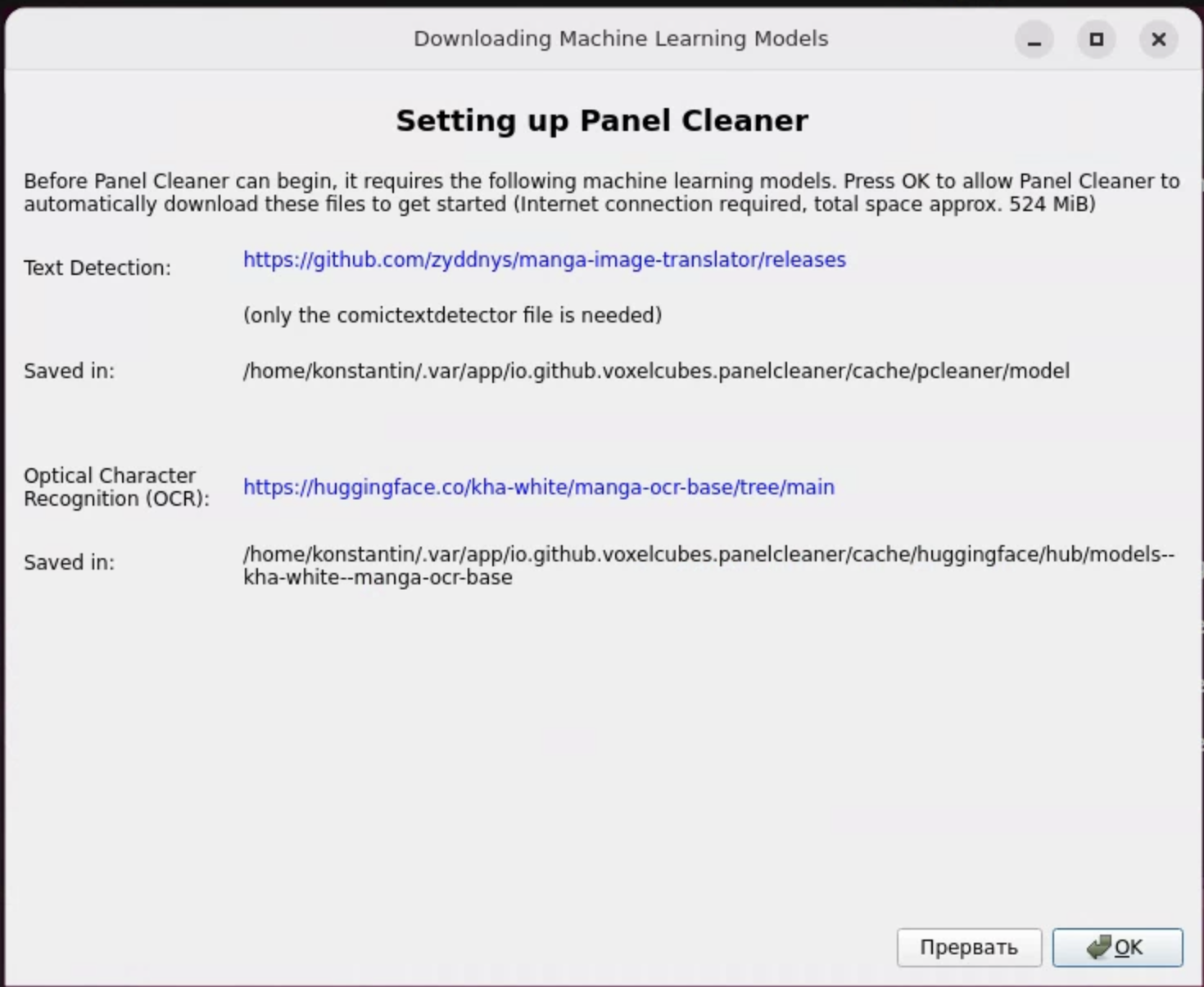 On first launch, the application will require additional ML download for text detection and recognition. Panel Cleaner will handle this task on its own, so there's no need to search for or configure anything additionally. However, if necessary, you can use your own OCR engines.