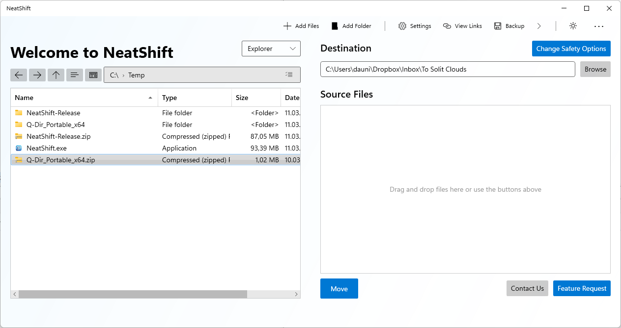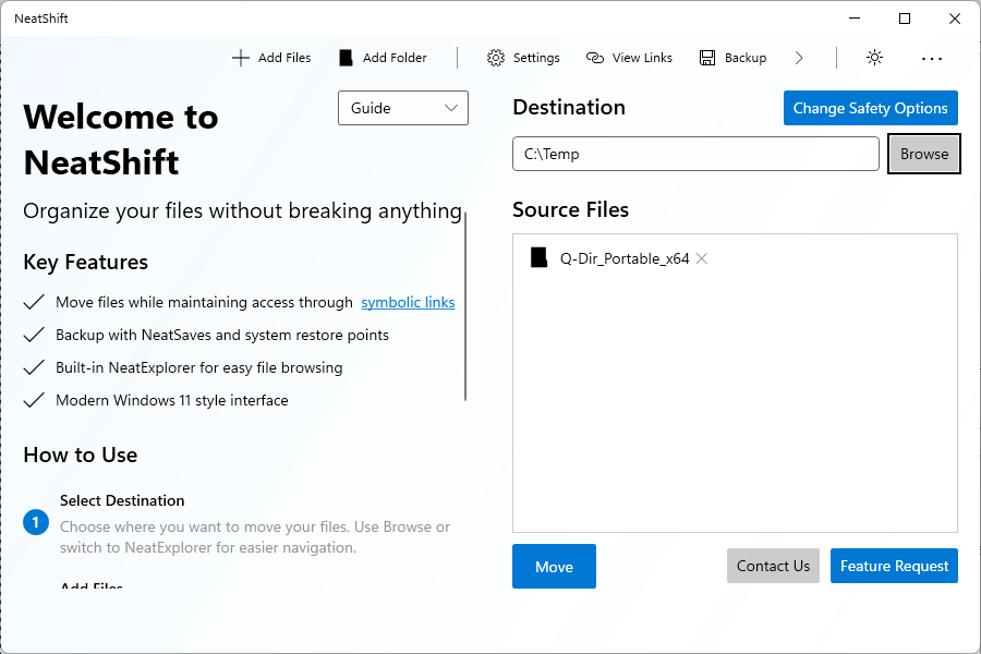 NeatShift is a utility for creating symbolic links through a user-friendly interface. It moves files while preserving their original path. It also supports backups and link viewing.