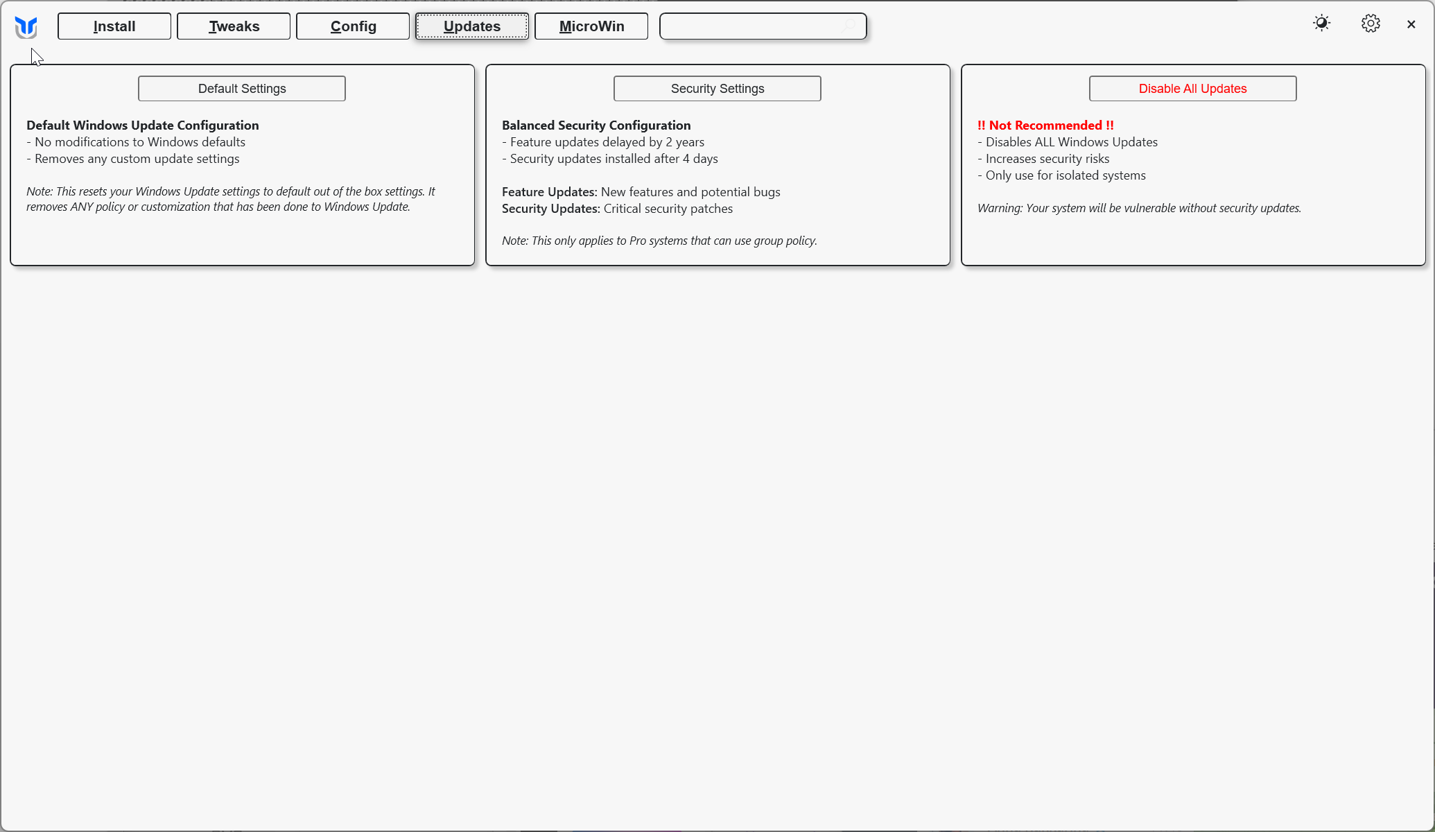 • Updates – Manage Windows update settings, choosing between default updates, deferred updates, or disabling them completely.