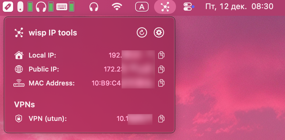 Wisp shows your local, external, and VPN IP addresses, as well as your MAC address, directly in the menu bar — no extra steps required.