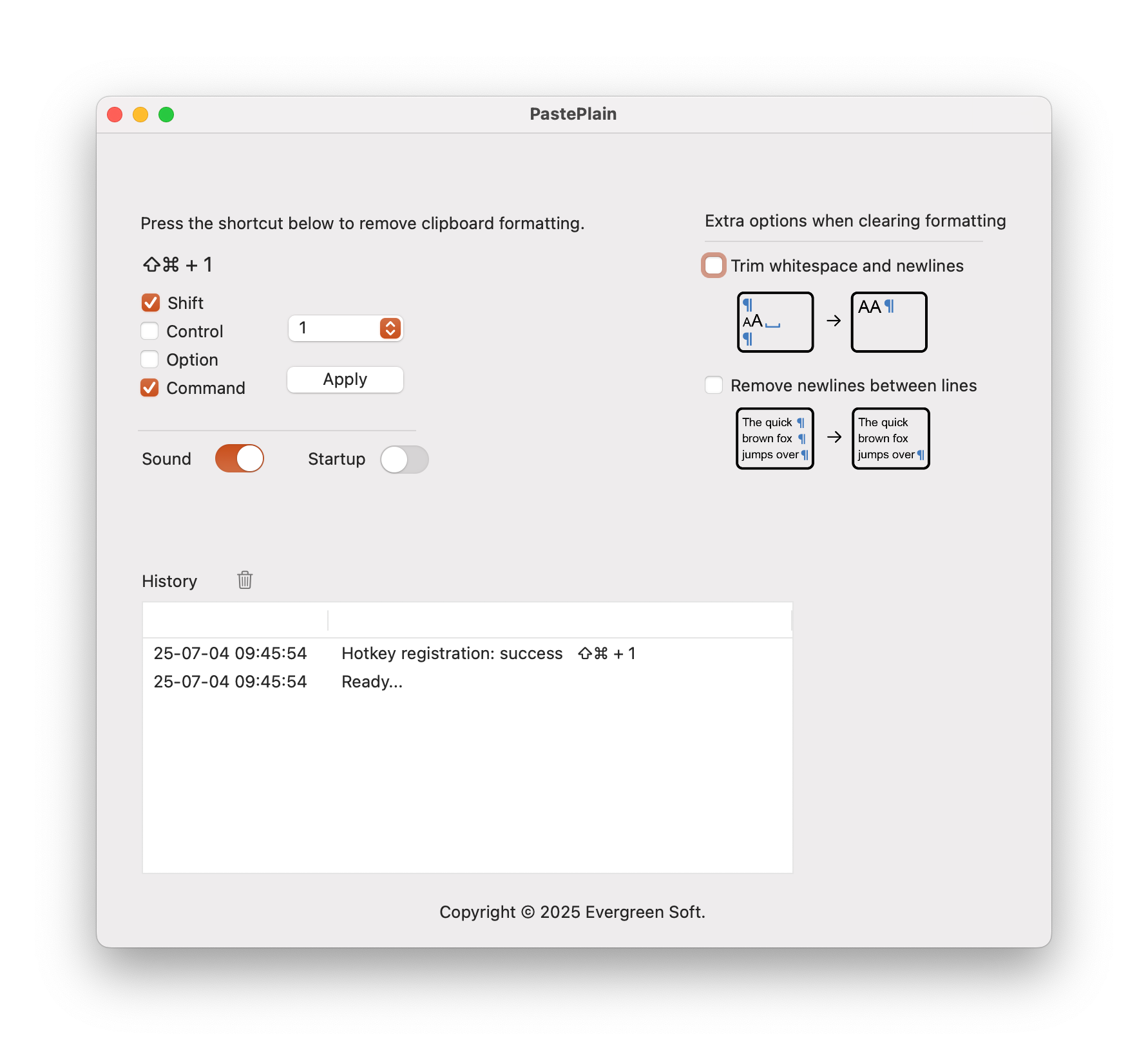 PastePlain is a utility for cleaning up clipboard text: it removes formatting, extra spaces, and line breaks. It also supports custom hotkeys.