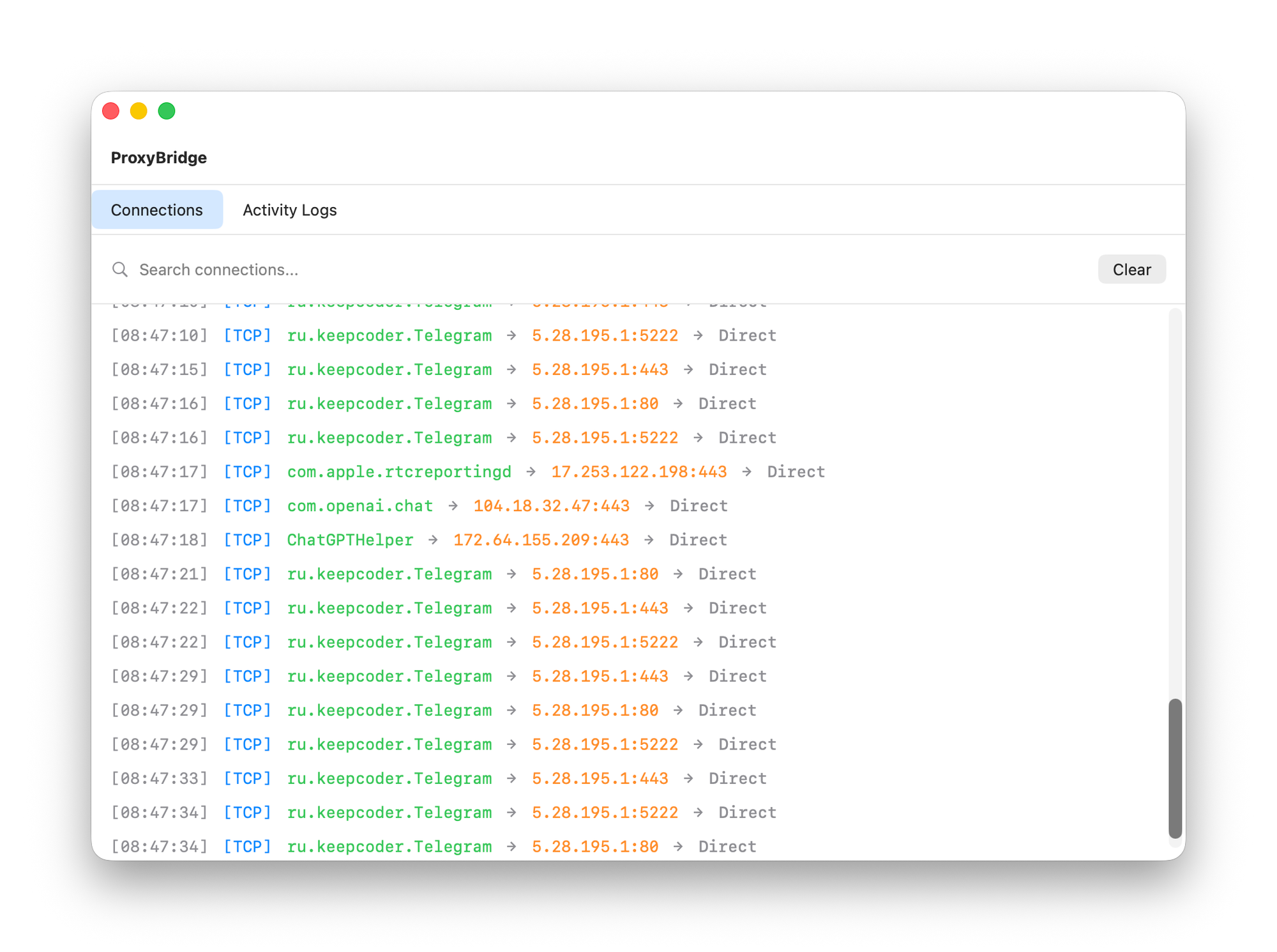After saving the rule, the selected application will start connecting through the specified proxy server. You can monitor whether everything is working correctly in the main ProxyBridge window.