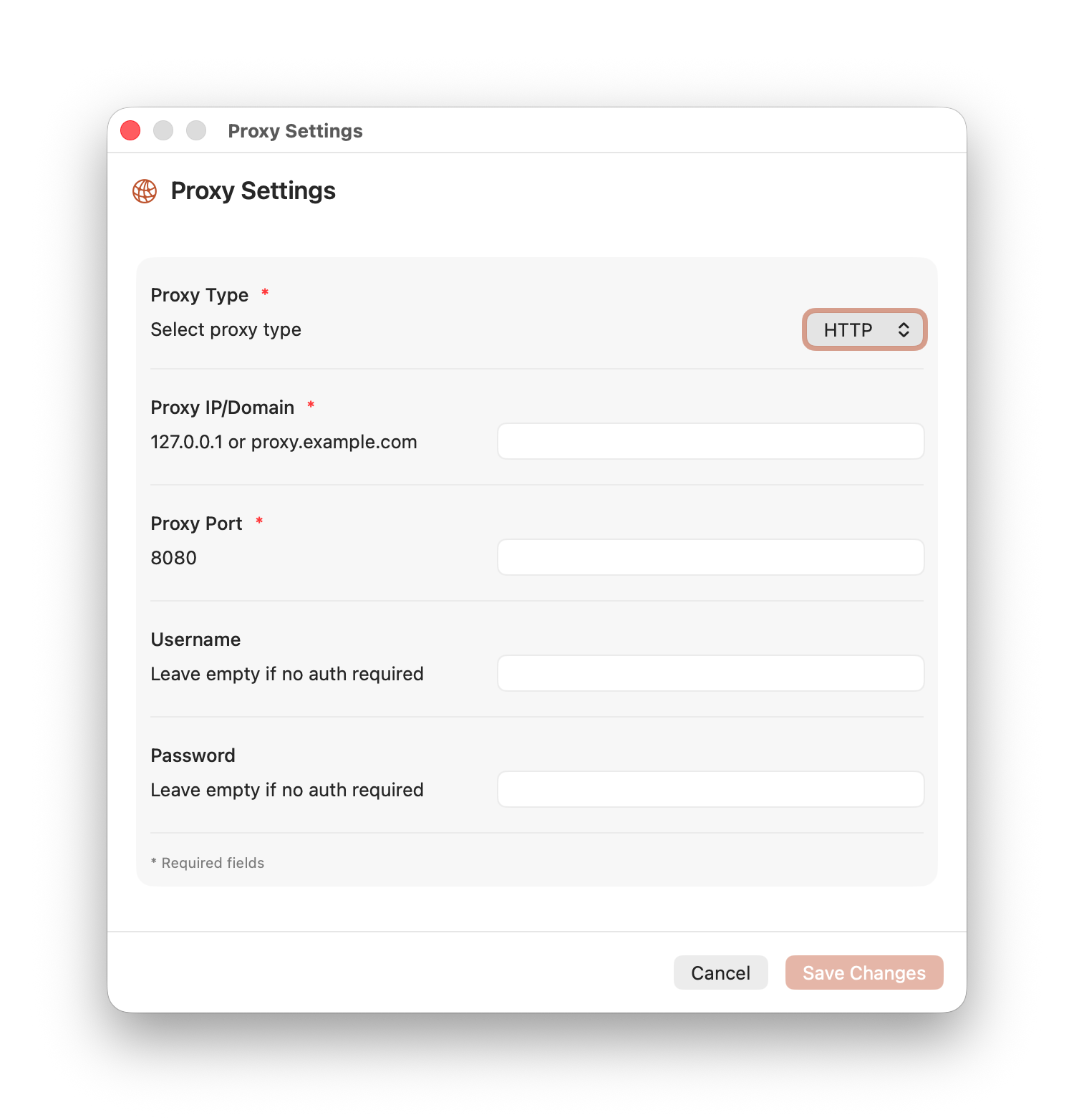 After launching the app, go to the proxy settings and specify the desired parameters. Both HTTP and SOCKS proxies are supported.