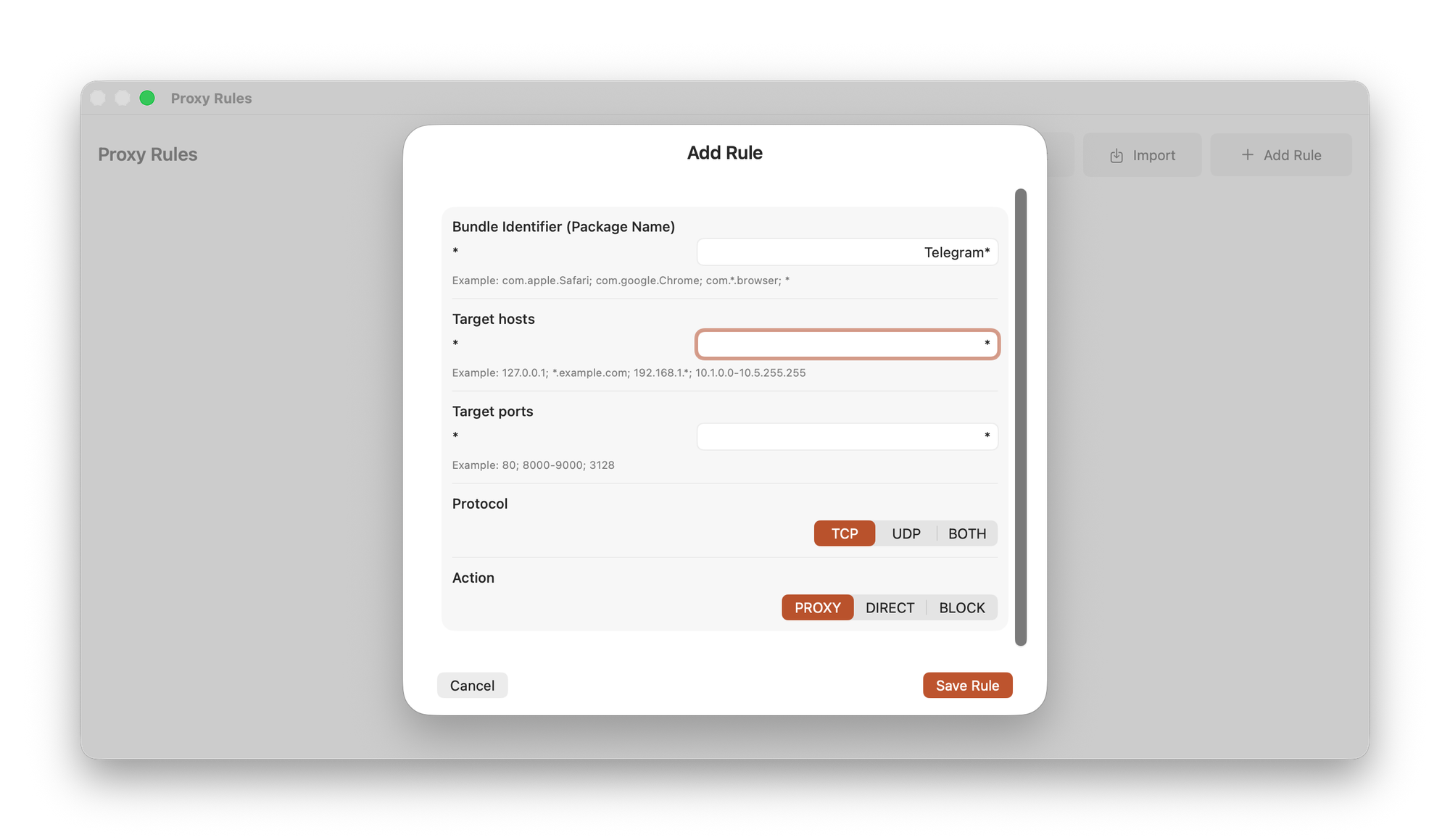 The second step is to open the rules section and create redirection rules. Here you need to specify the full name or part of the application name, and choose host parameters, ports, and other options.