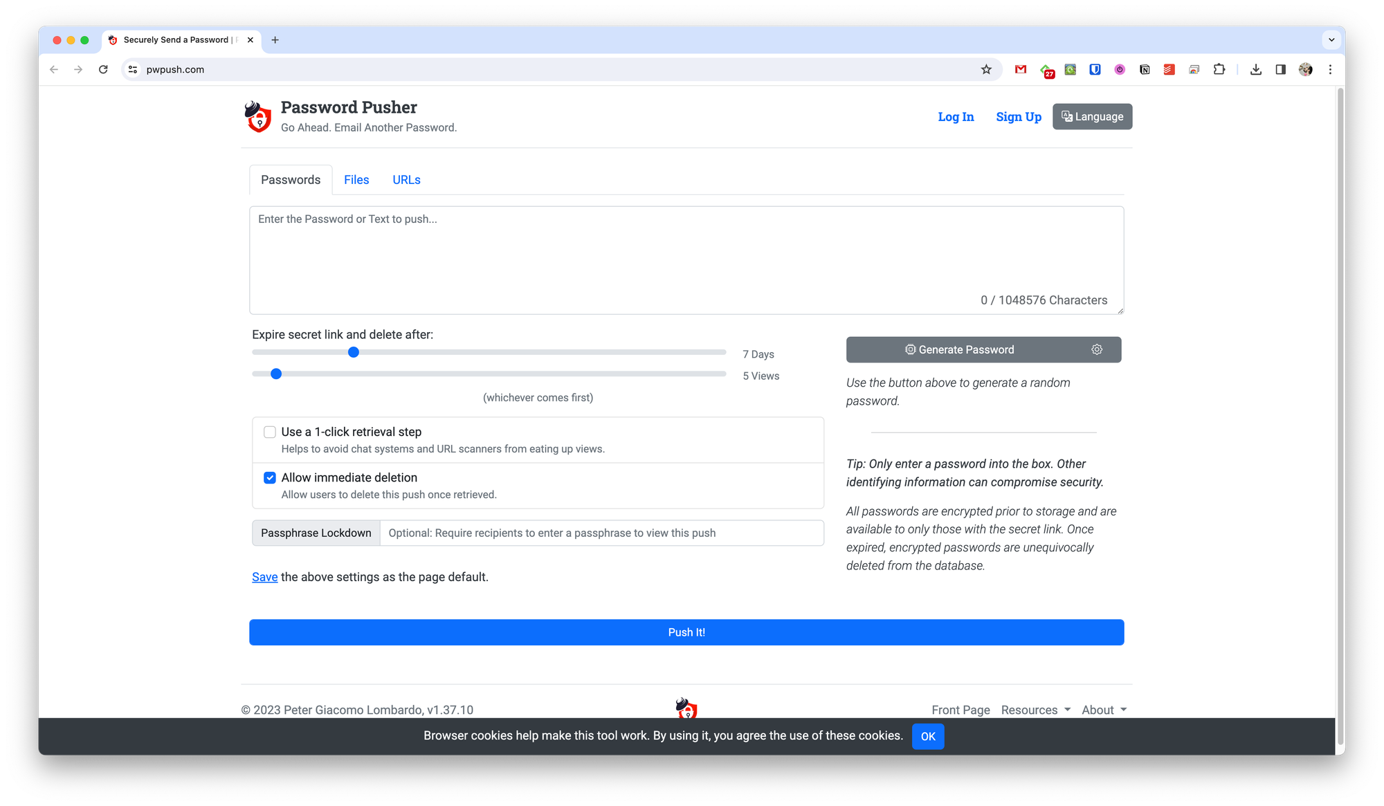 When you visit the site, you have three options for sending data, depending on the type of data: password, files, or links.