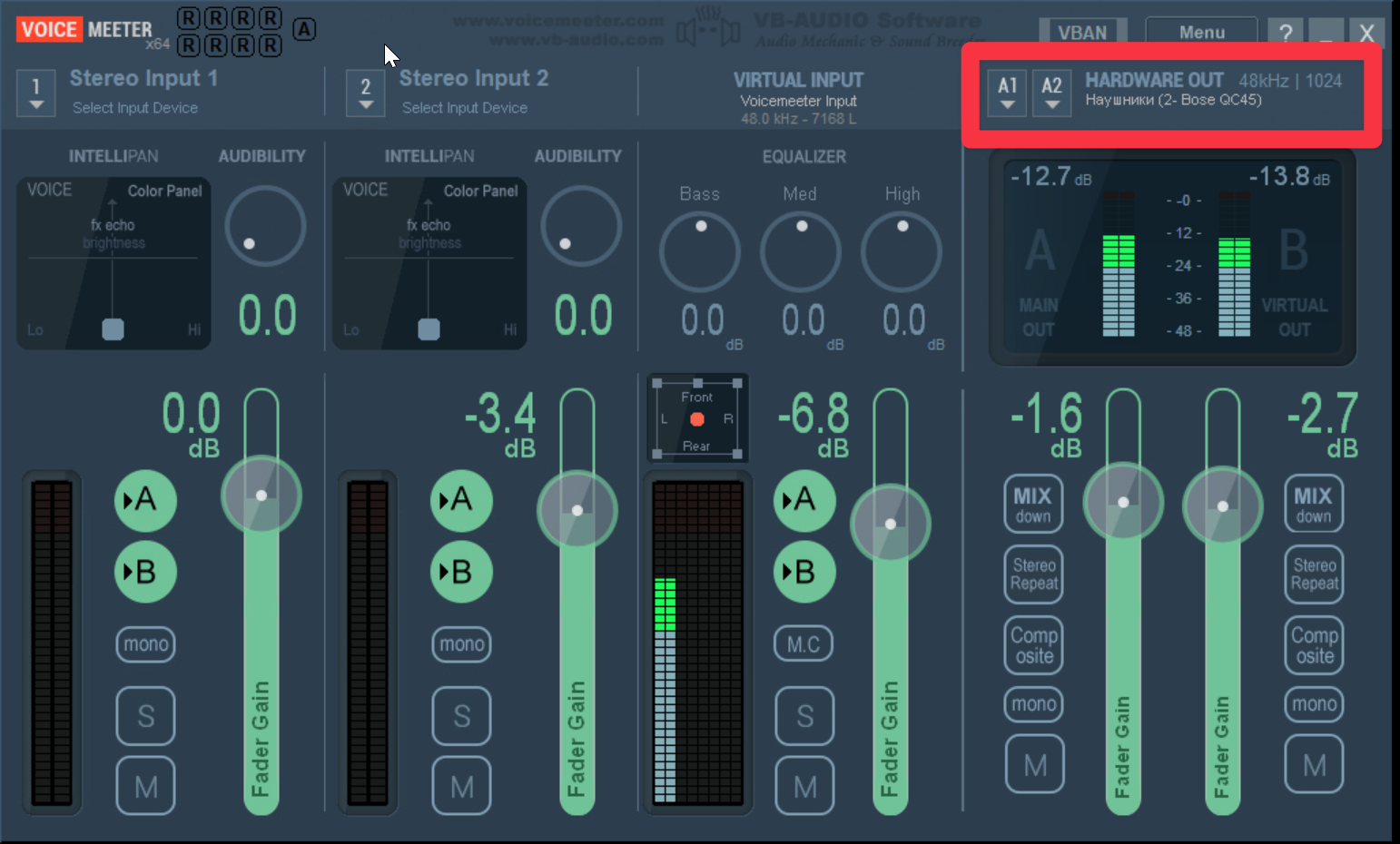 The setup takes literally a minute. First, in the Voicemeeter app under the HARDWARE OUT section, click the A1 and A2 buttons at the top and select the desired output devices.