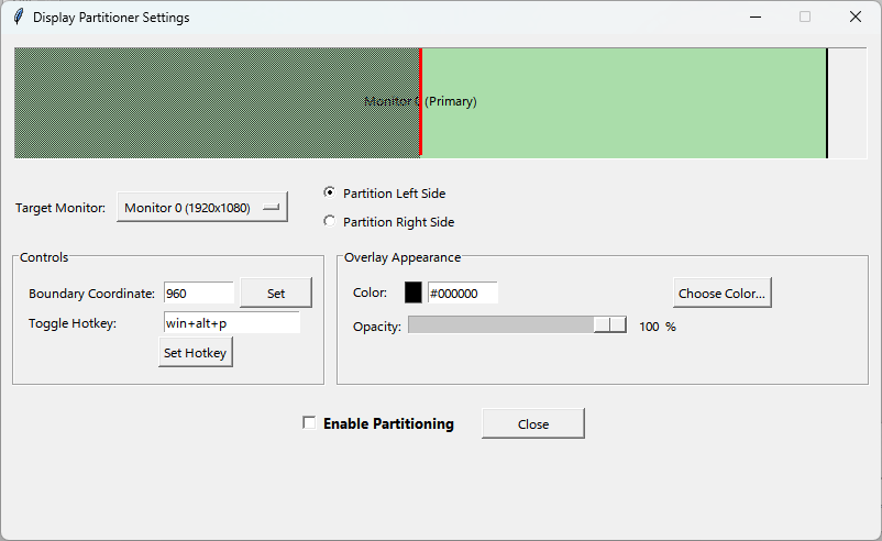 Display Partitioner is a utility for splitting the screen and disabling part of it with a dark overlay, which is useful for ultrawide or damaged monitors.