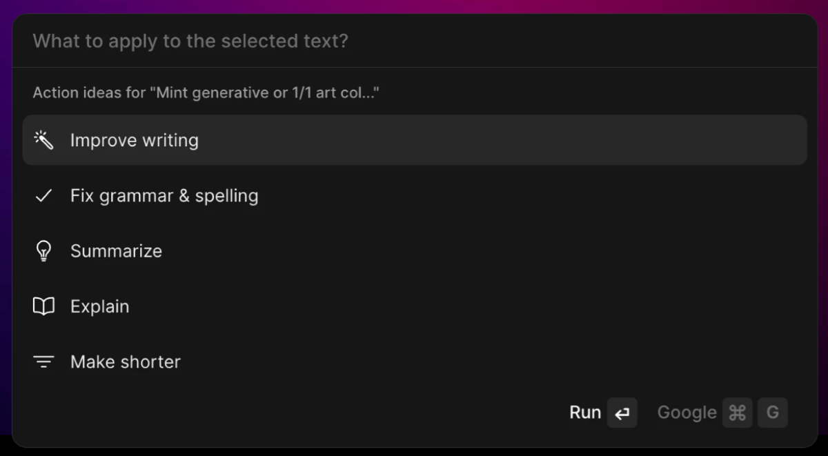 Cmd J will help you start a dialogue with ChatGPT on any page by pressing the hotkey Cmd/Alt + J. After that, a window will appear where you can have a conversation just like on the neural network site.