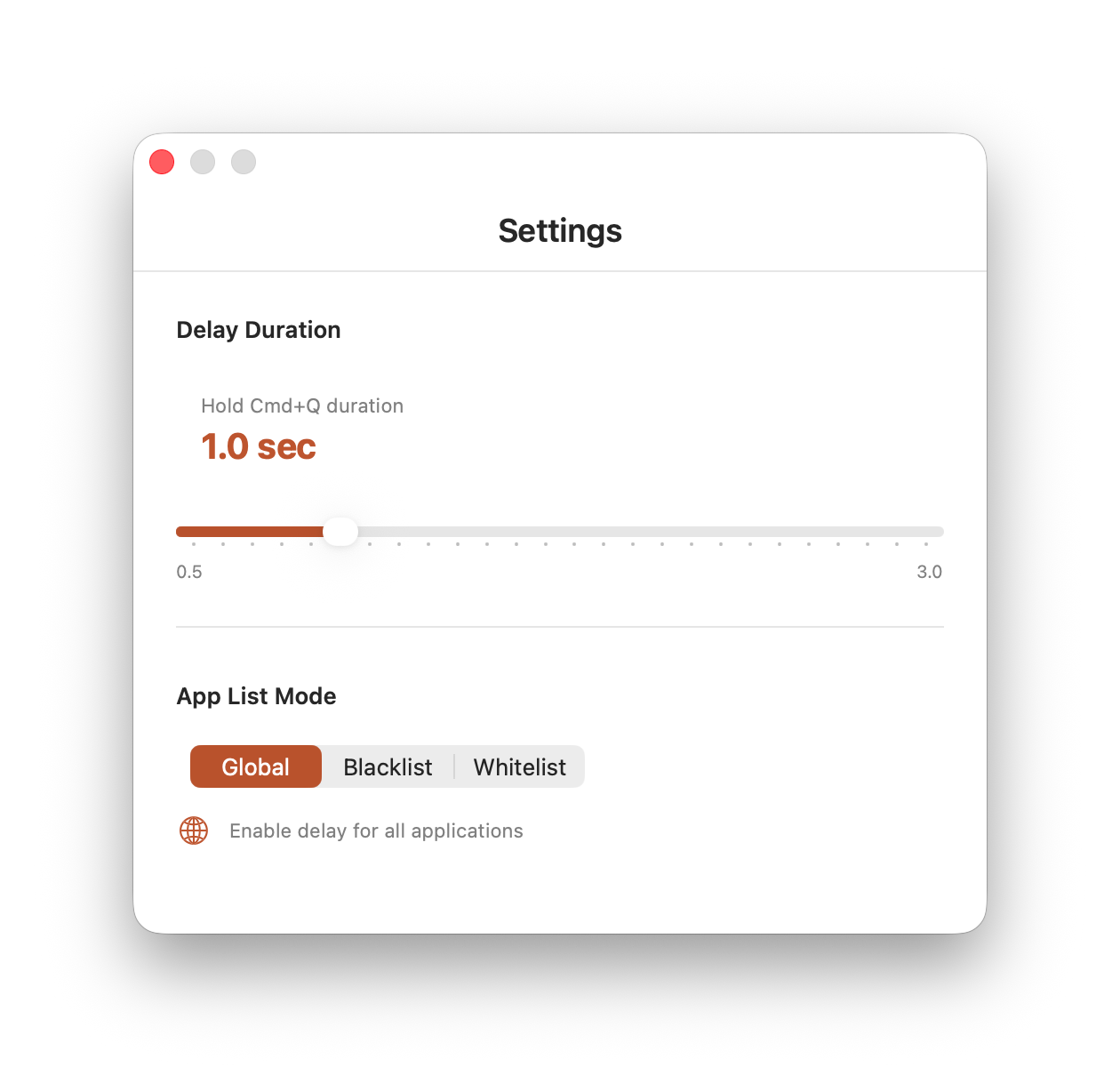 In SlowQuit settings, you can adjust the timer duration from 0.5 to 3 seconds, and specify which apps the timer should or shouldn’t apply to.