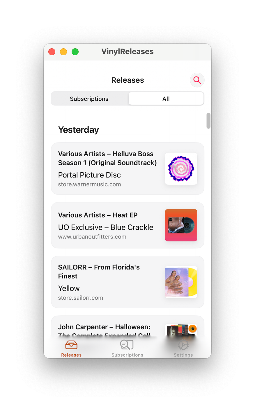 VinylReleases alerts you to new vinyl releases, lets you subscribe to artists or keywords, and delivers push notifications.