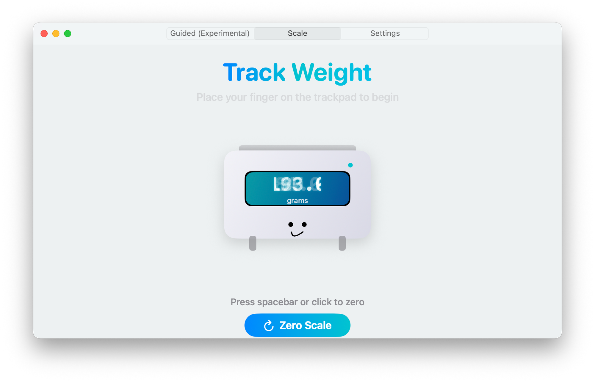 To make it work, place your finger on the trackpad and press the space bar. This resets the scale to zero, after which you can put the object on the trackpad and get its weight.