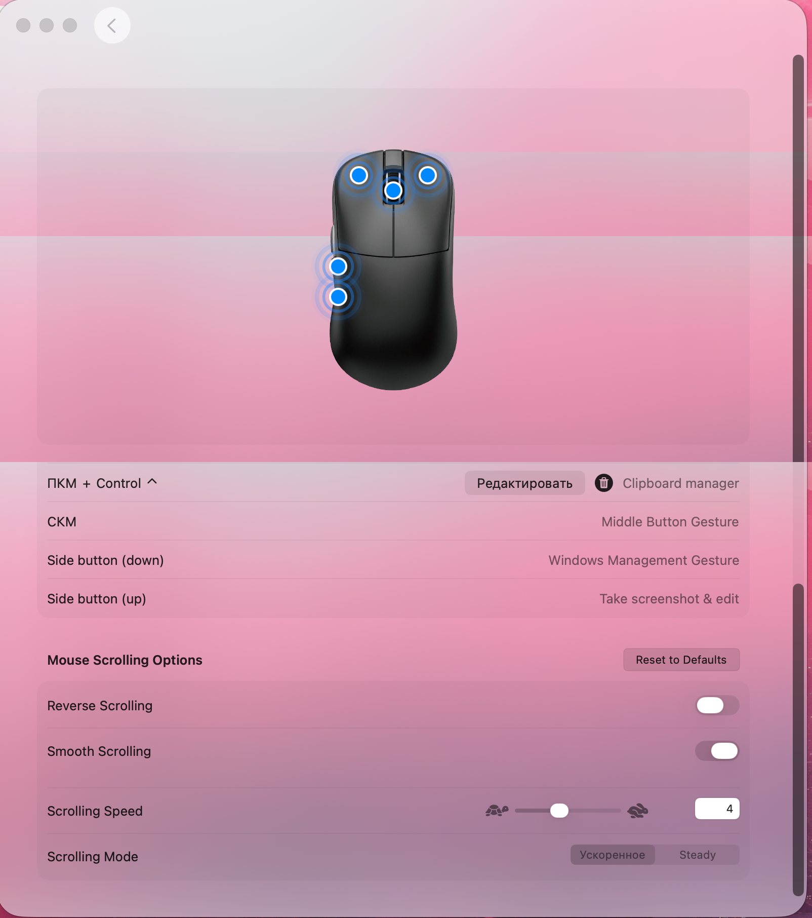 You can add actions like launching programs or copying text to the clipboard. In addition, quick actions can also be assigned to mouse gestures. For example, holding a button and moving the mouse to the left can take you to the previous page.