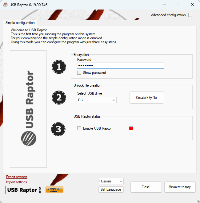 You don’t need to do anything complicated: just plug in the flash drive and launch the utility. In the utility, specify the access password, click Create k3y file, and enable the Enable USB Raptor checkbox.