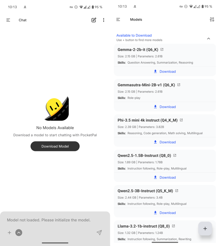 Right after the first launch, PocketPal AI will prompt you to load a model. When you tap Download Model, you’ll be taken to a list of all available Hugging Face models. You can also load a local model if needed.