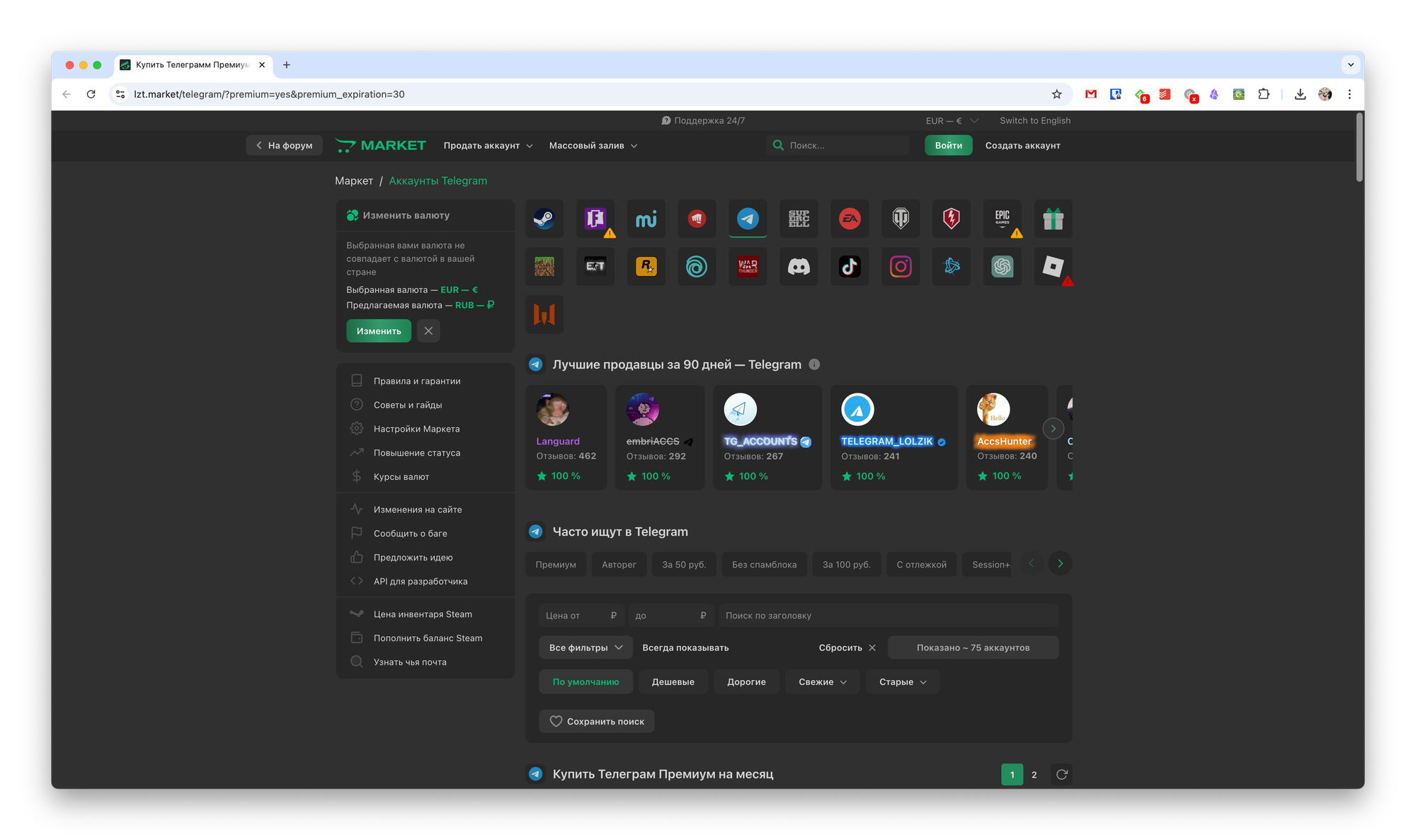 Поиск аккаунтов в сервисе Lolzteam можно осуществлять по тегам «без спамблока», «с отлежкой», «новый», «авторег» и другим — параметры указаны для Telegram. Например, учётные записи Steam легко отфильтровать по бану VAC, цене, доступу к почте и т.д.