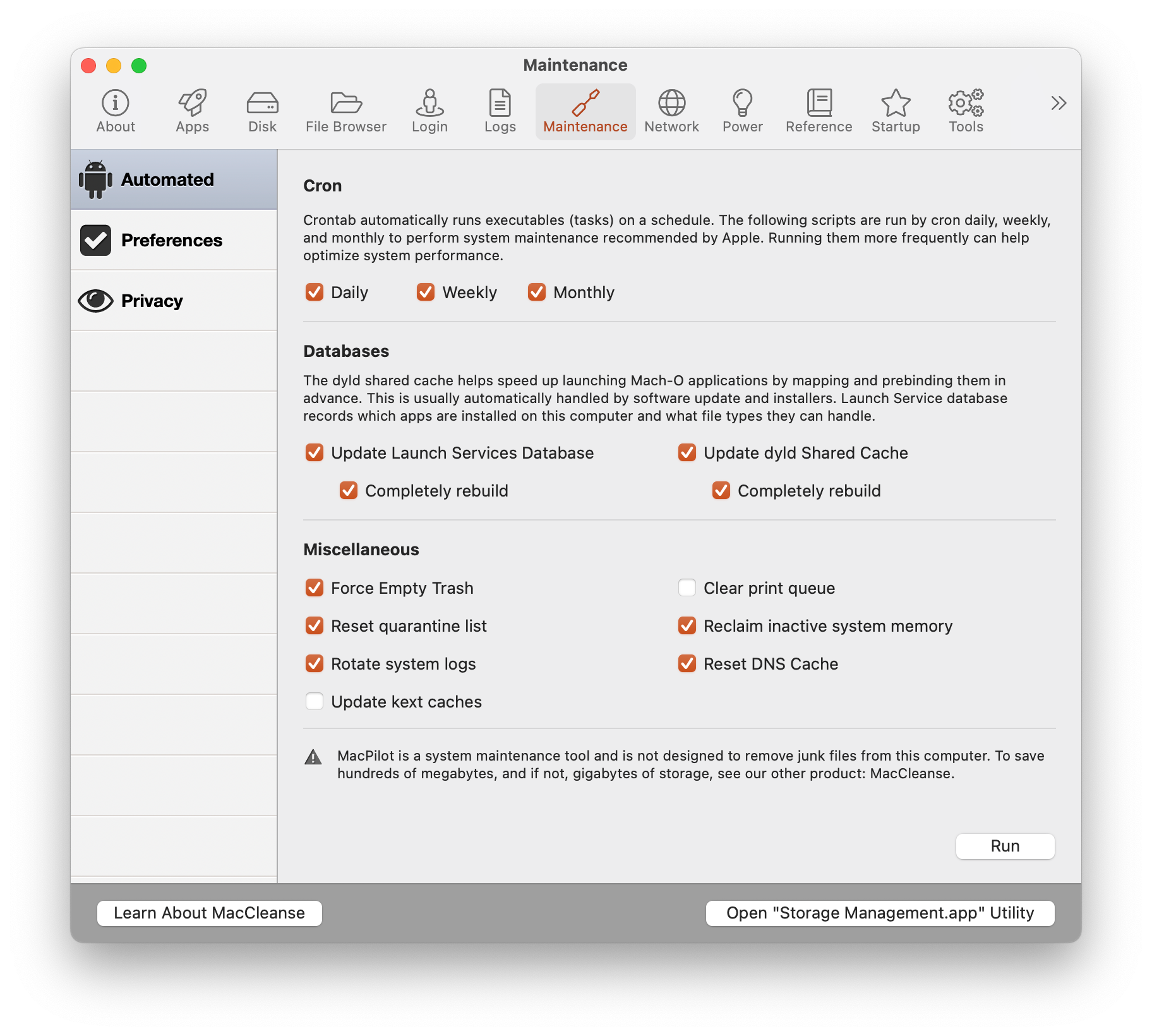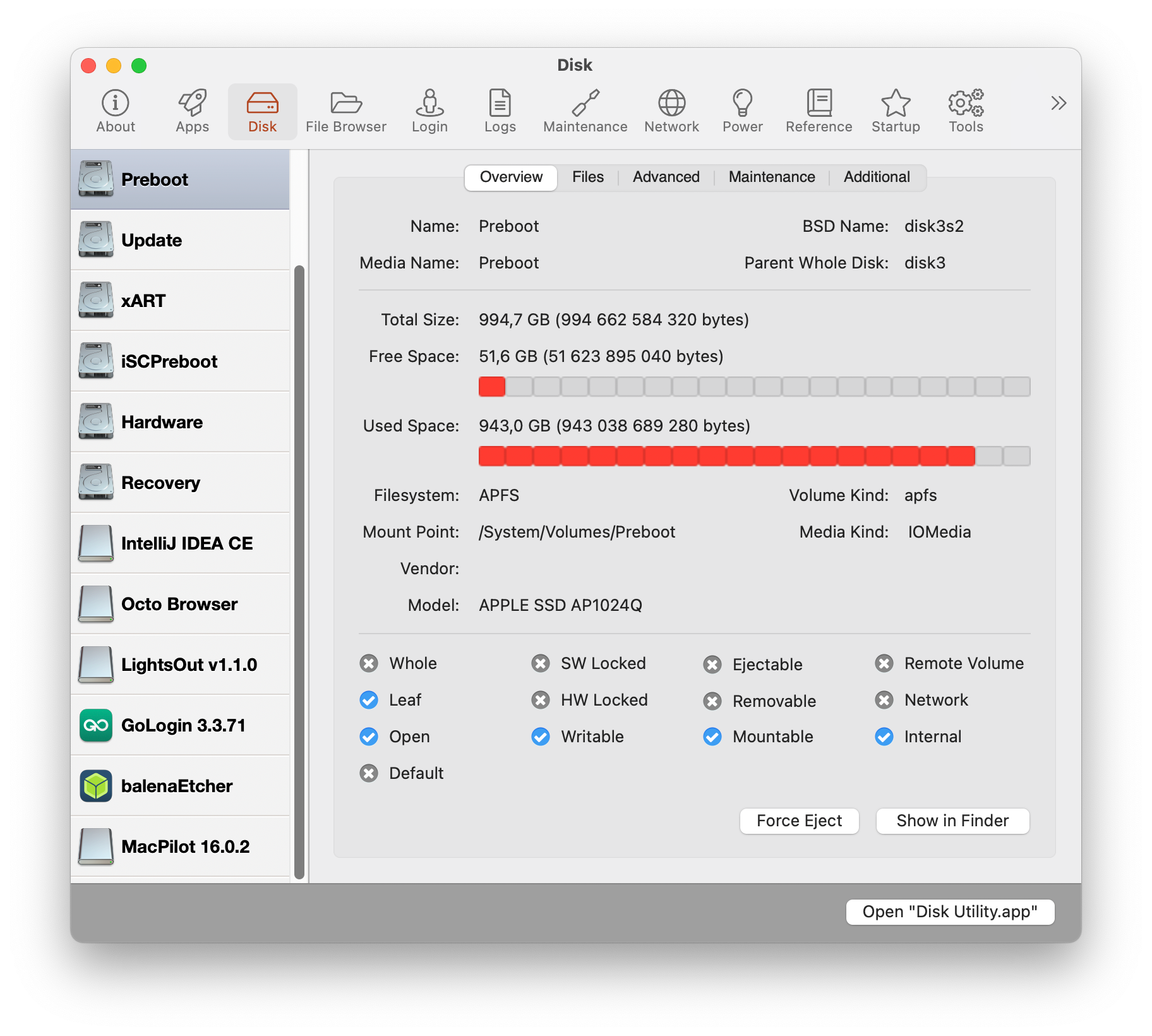While you can’t directly manage partitions here, MacPilot provides quick access to the system Disk Utility for advanced partitioning tasks.