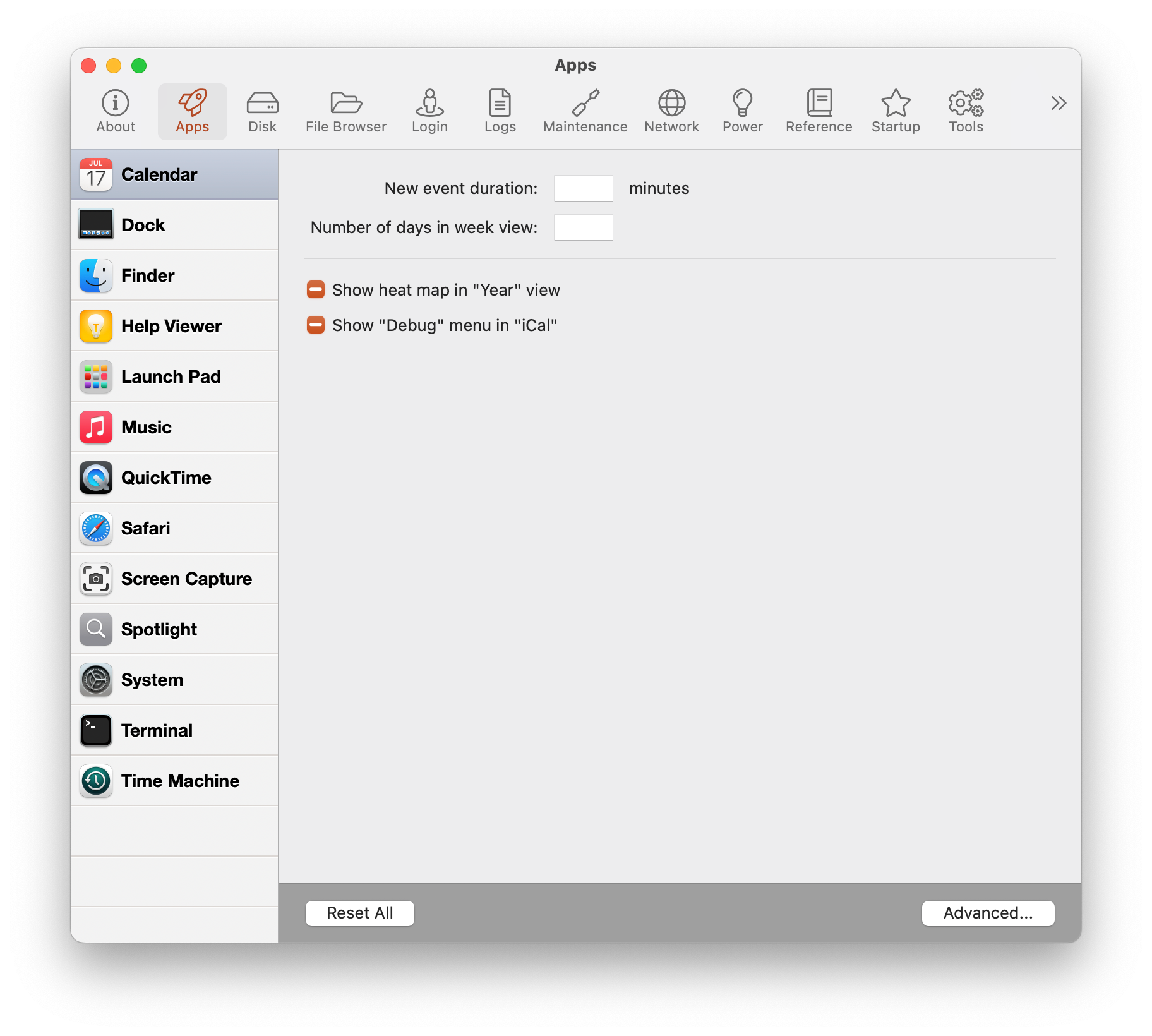 The Apps section allows you to change the settings of various system applications. You can tweak preferences for Calendar, Dock, Safari, Time Machine, and others.